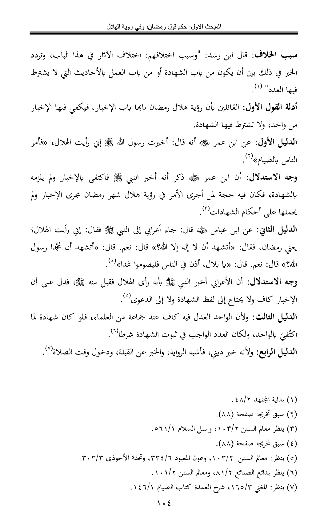 الدليل الثاني: عن ابن عباس - رضي الله عنه - قال: جاء أعرابي إلى النبي - صلى الله عليه وسلم - فقال: إني رأيت الهلال؛ يعني رمضان، فقال: «أتشهد أن لا إله إلا الله؟ » قال: نعم. قال: «أتشهد أن محمدا رسول الله؟ » قال: نعم. قال: «يا بلال، أذن في الناس فليصوموا غدا» (¬4).