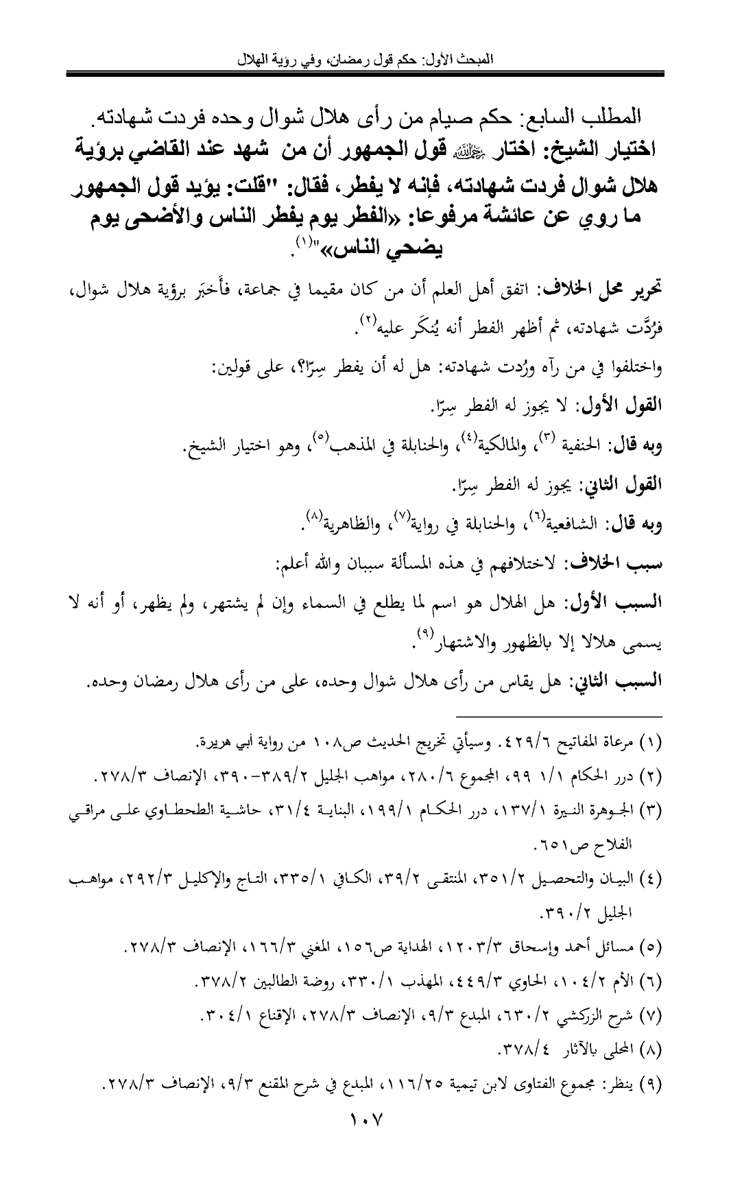 اختيار الشيخ: اختار قول الجمهور أن من شهد عند القاضي برؤية هلال شوال فردت شهادته، فإنه لا يفطر، فقال: "قلت: يؤيد قول الجمهور ما روي عن عائشة مرفوعا: «الفطر يوم يفطر الناس والأضحى يوم يضحي الناس» " (¬1).