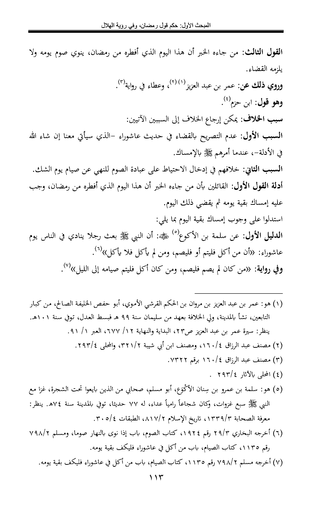 الدليل الأول: عن سلمة بن الأكوع (¬5) - رضي الله عنه -: أن النبي - صلى الله عليه وسلم - بعث رجلا ينادي في الناس يوم عاشوراء: «أن من أكل فليتم أو فليصم، ومن لم يأكل فلا يأكل» (¬6).