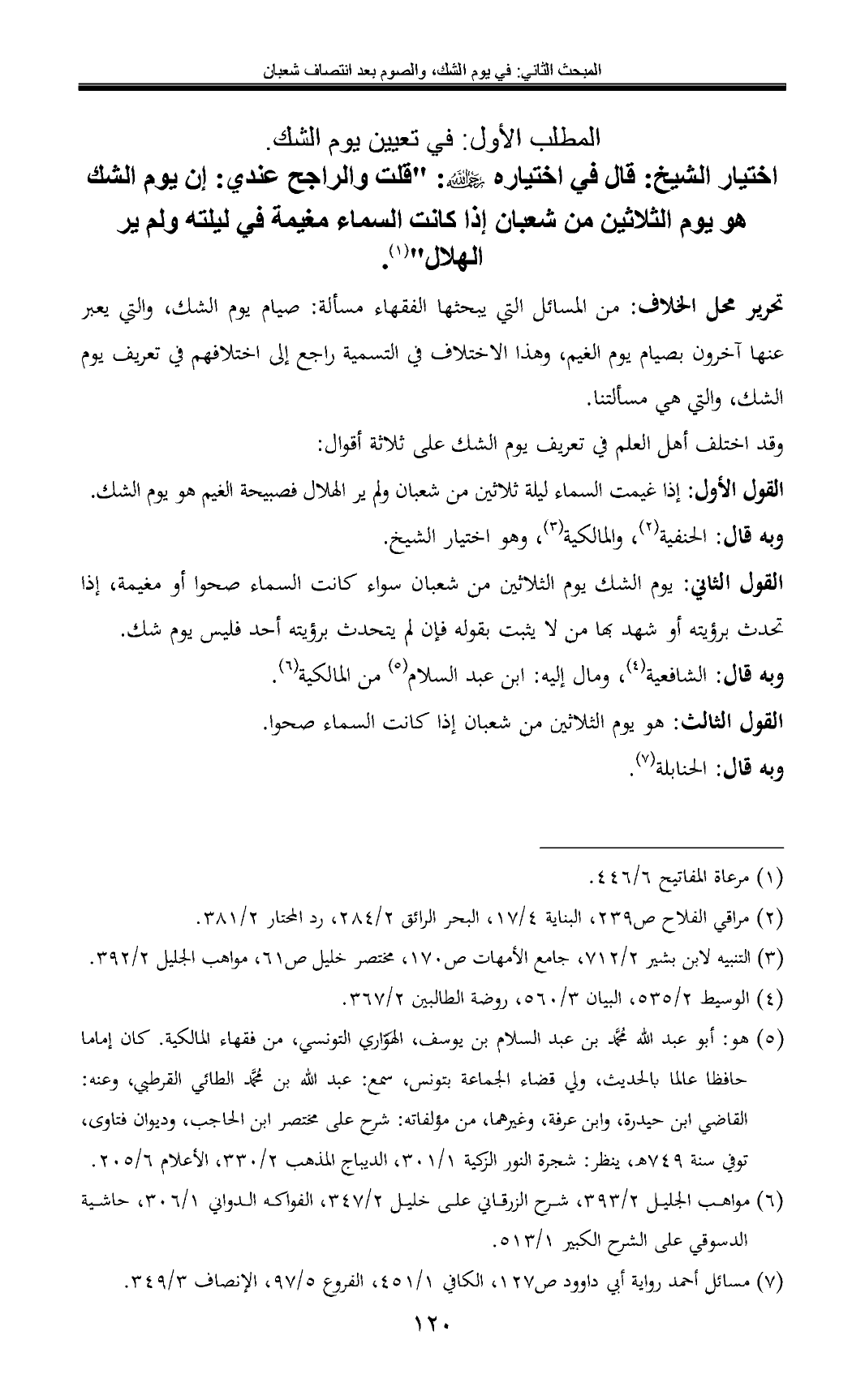 اختيار الشيخ: قال في اختياره: "قلت والراجح عندي: إن يوم الشك هو يوم الثلاثين من شعبان إذا كانت السماء مغيمة في ليلته ولم ير الهلال" (¬1).