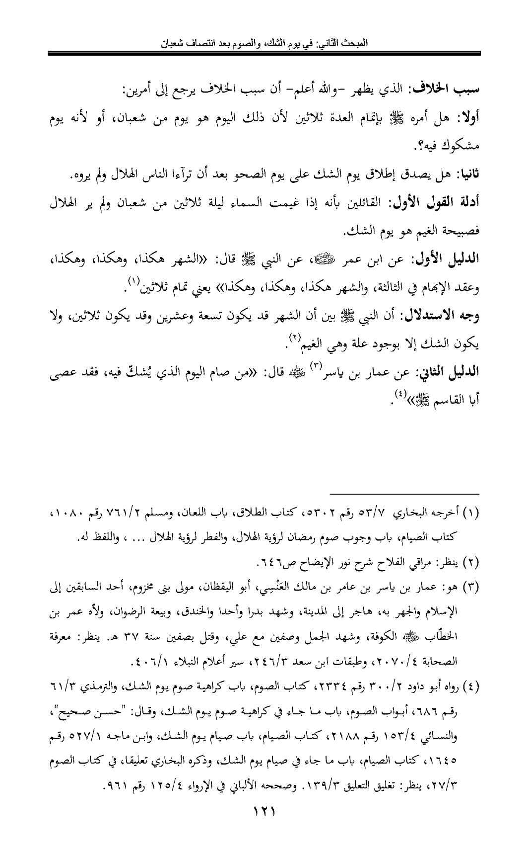 الدليل الثاني: عن عمار بن ياسر (¬3) - رضي الله عنه - قال: «من صام اليوم الذي يُشكّ فيه، فقد عصى أبا القاسم - صلى الله عليه وسلم -» (¬4).