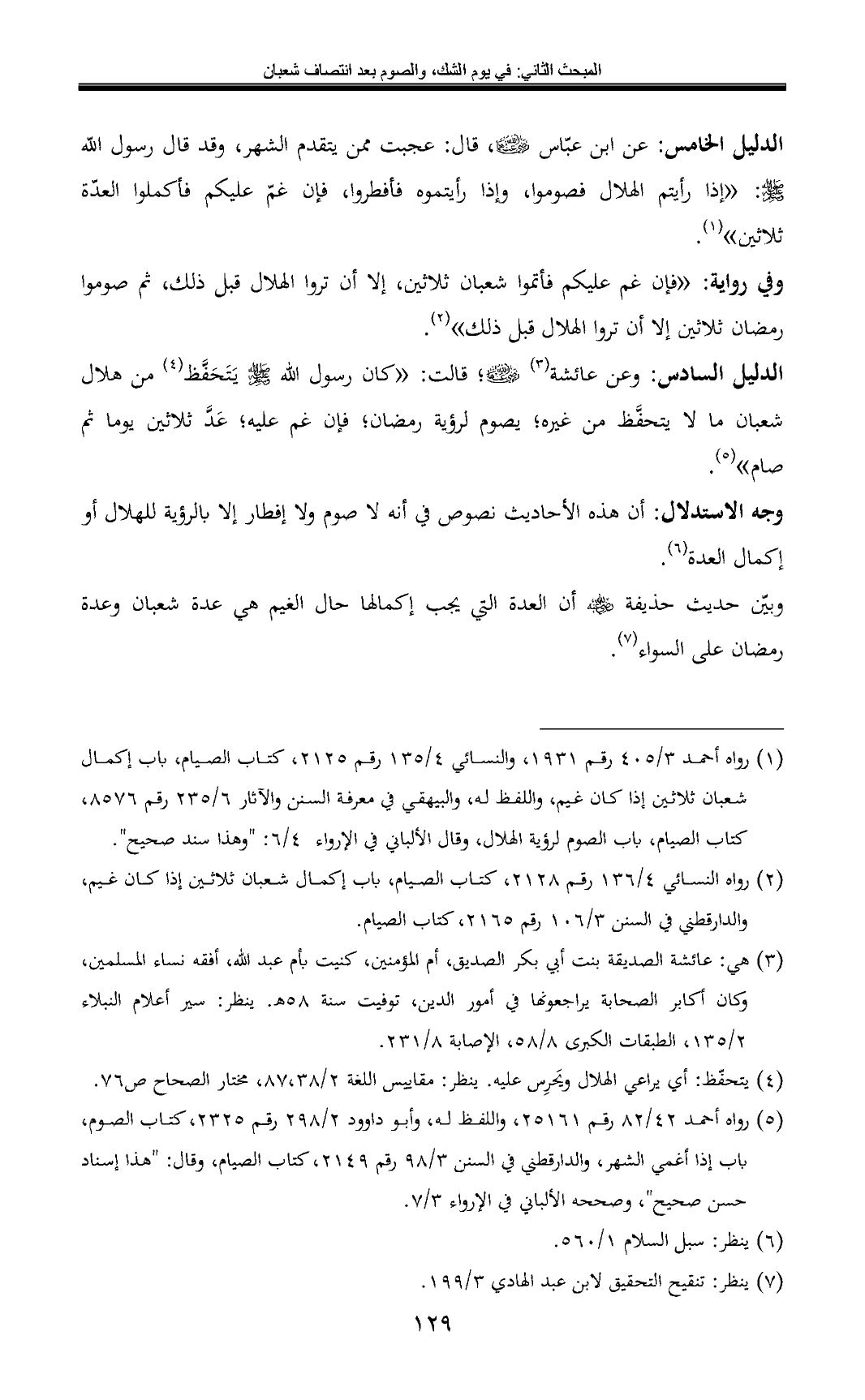 الدليل السادس: وعن عائشة (¬3) - رضي الله عنها -؛ قالت: «كان رسول الله - صلى الله عليه وسلم - يَتَحَفَّظ (¬4) من هلال شعبان ما لا يتحفَّظ من غيره؛ يصوم لرؤية رمضان؛ فإن غم عليه؛ عَدَّ ثلاثين يوما ثم صام» (¬5).
