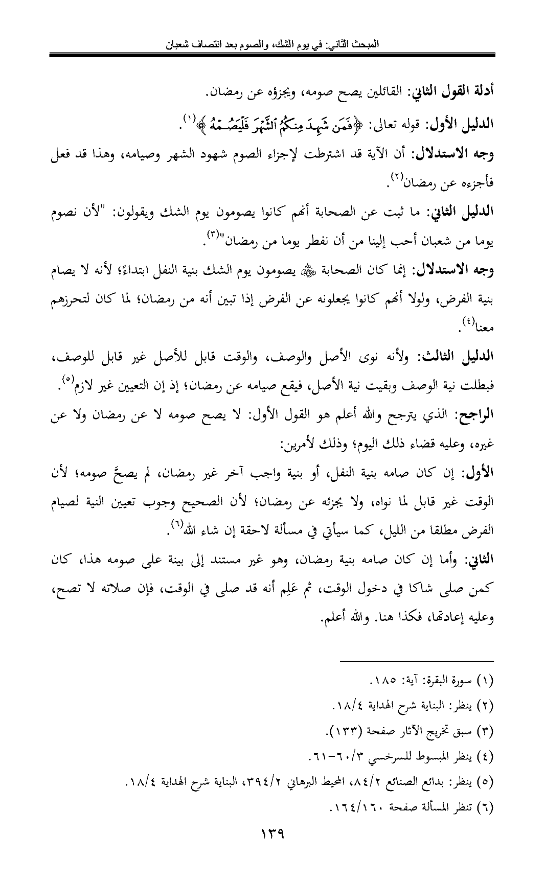 الدليل الثالث: ولأنه نوى الأصل والوصف، والوقت قابل للأصل غير قابل للوصف، فبطلت نية الوصف وبقيت نية الأصل، فيقع صيامه عن رمضان؛ إذ إن التعيين غير لازم (¬5).