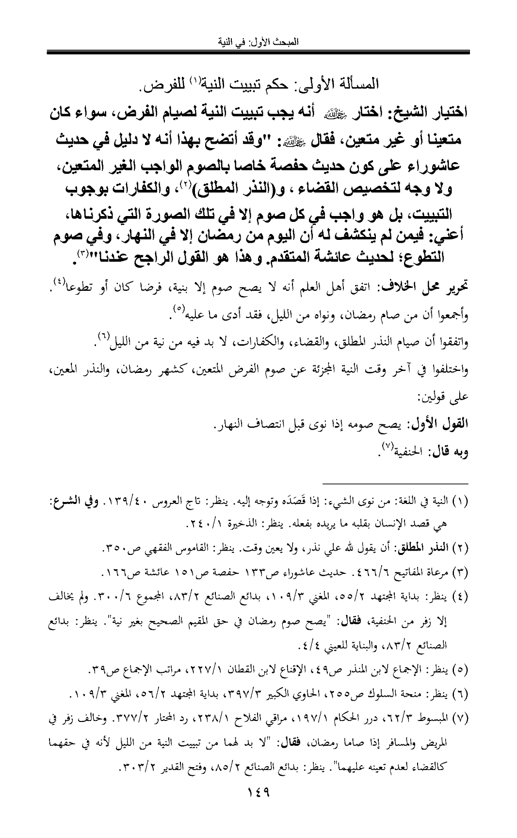 (¬4) ينظر: بداية المجتهد 2/ 55، المغني 3/ 109، بدائع الصنائع 2/ 83، المجموع 6/ 300. ولم يخالف إلا زفر من الحنفية, فقال: "يصح صوم رمضان في حق المقيم الصحيح بغير نية". ينظر: بدائع الصنائع 2/ 83، والبناية للعيني 4/ 4.