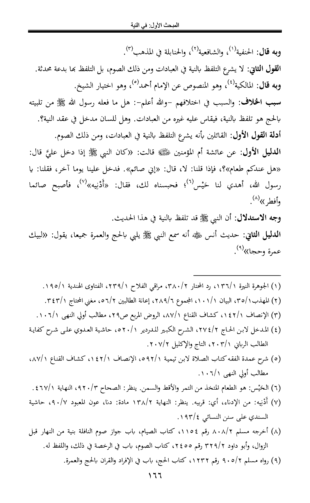 سبب الخلاف: والسبب في اختلافهم -والله أعلم-: هل ما فعله رسول الله - صلى الله عليه وسلم - من تلبيته بالحج هو تلفظ بالنية، فيقاس عليه غيره من العبادات. وهل للسان مدخل في عقد النية؟ .