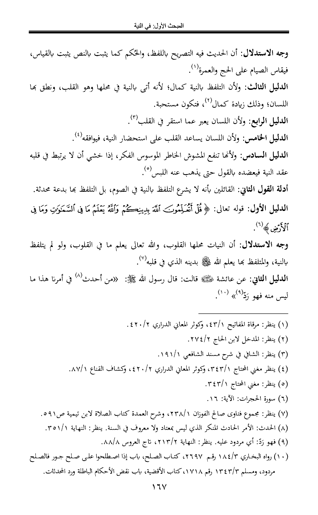 الدليل السادس: ولأنها تنفع المشوش الخاطر الموسوس الفكر، إذا خشي أن لا يرتبط في قلبه عقد النية فيعضده بالقول حتى يذهب عنه اللبس (¬5).