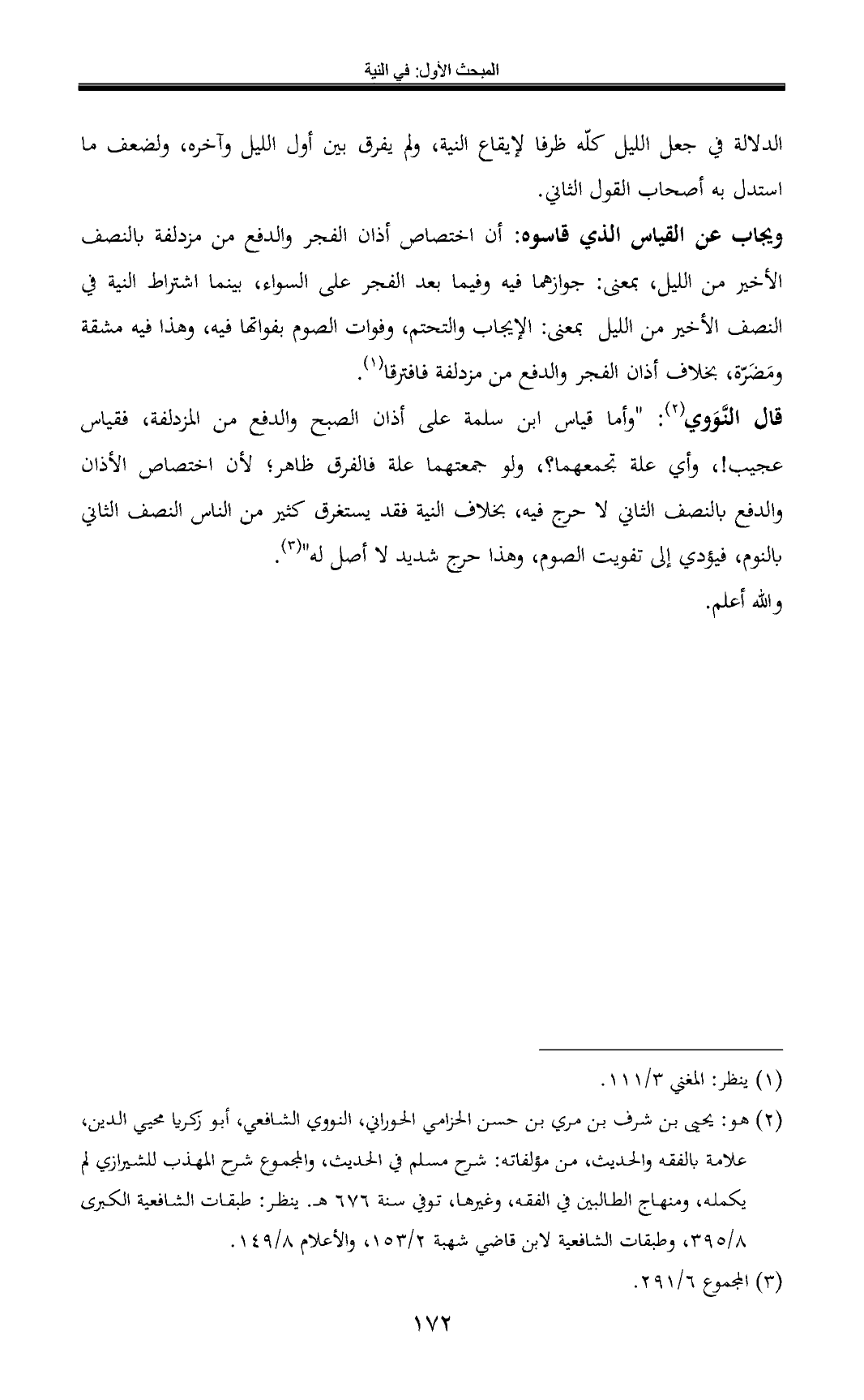 قال النَّوَوي (¬2): "وأما قياس ابن سلمة على أذان الصبح والدفع من المزدلفة، فقياس عجيب! ، وأي علة تجمعهما؟ ، ولو جمعتهما علة فالفرق ظاهر؛ لأن اختصاص الأذان والدفع بالنصف الثاني لا حرج فيه، بخلاف النية فقد يستغرق كثير من الناس النصف الثاني بالنوم، فيؤدي إلى تفويت الصوم، وهذا حرج شديد لا أصل له" (¬3).