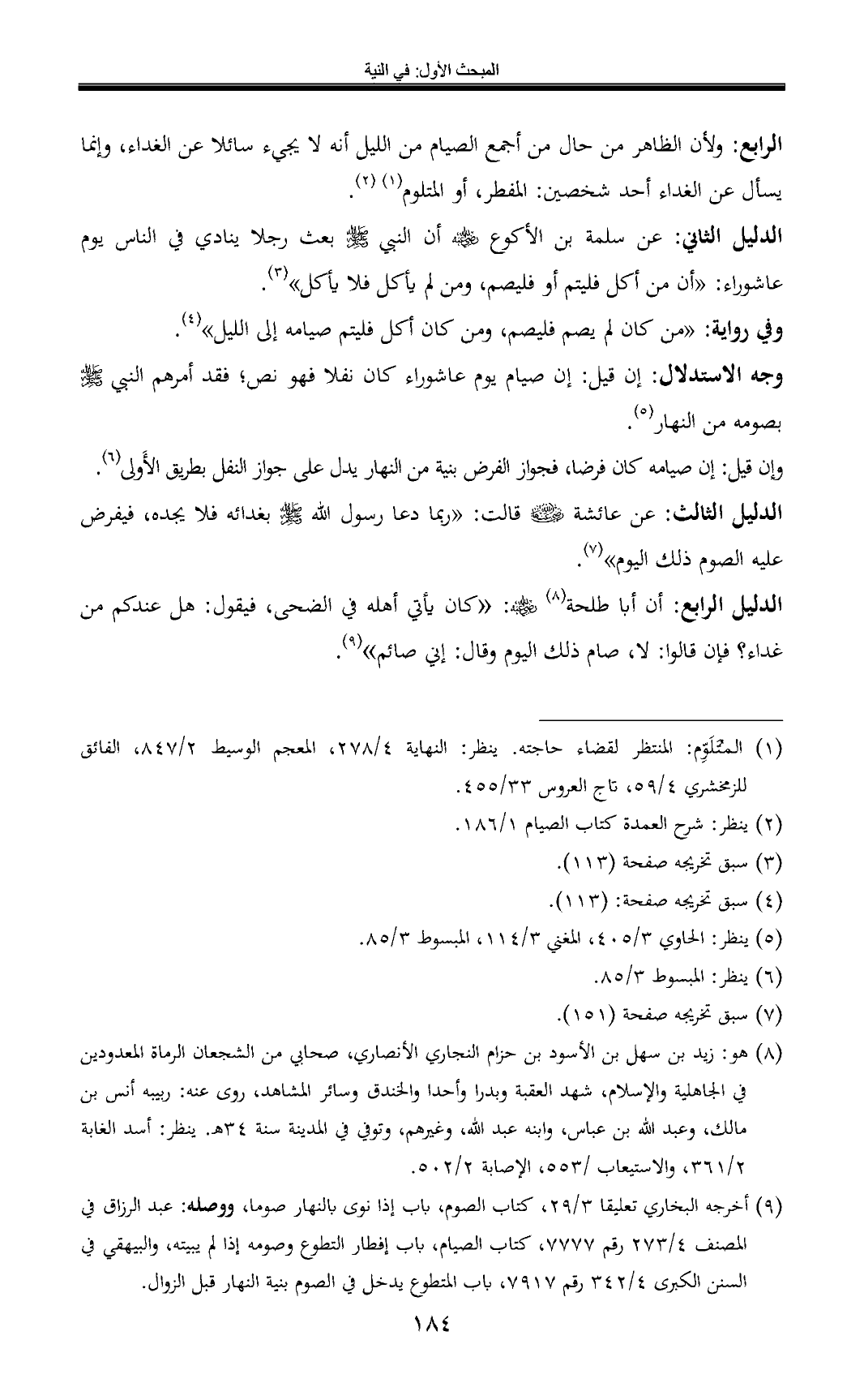 الدليل الرابع: أن أبا طلحة (¬8) - رضي الله عنه -: «كان يأتي أهله في الضحى, فيقول: هل عندكم من غداء؟ فإن قالوا: لا، صام ذلك اليوم وقال: إني صائم» (¬9).