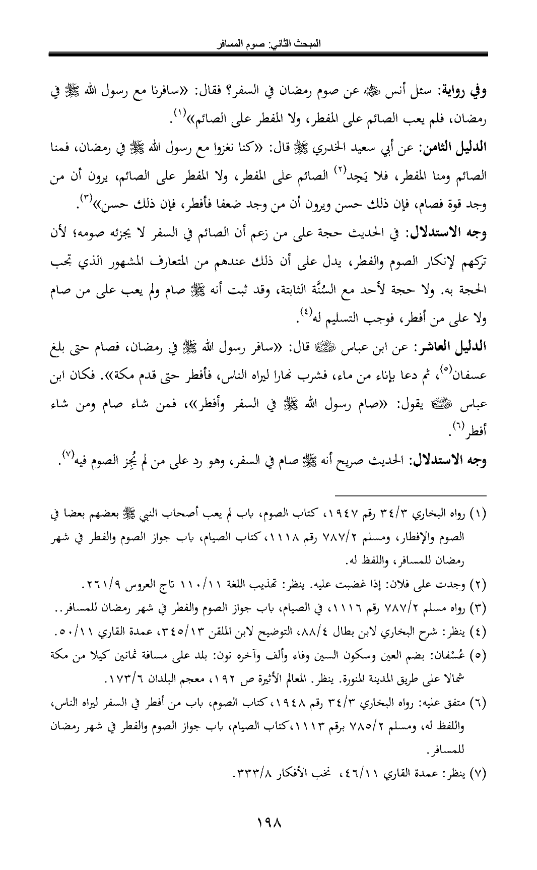 الدليل العاشر: عن ابن عباس - رضي الله عنهما - قال: «سافر رسول الله - صلى الله عليه وسلم - في رمضان، فصام حتى بلغ عسفان (¬5) , ثم دعا بإناء من ماء، فشرب نهارا ليراه الناس، فأفطر حتى قدم مكة». فكان ابن عباس - رضي الله عنهما - يقول: «صام رسول الله - صلى الله عليه وسلم - في السفر وأفطر»، فمن شاء صام ومن شاء أفطر (¬6).