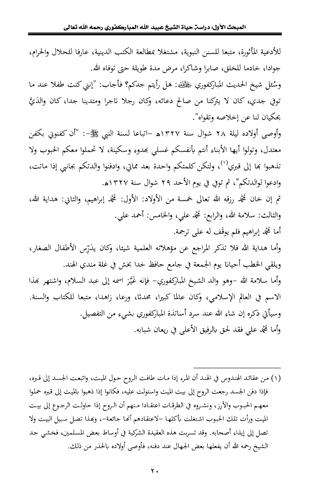 (¬1) من عقائد الهندوس في الهند أن المرء إذا مات طافت الروح حول الميت, واتبعت الجسد إلى قبره, فإذا دفن الجسد رجعت الروح إلى بيت الميت واستولت عليه, فكانوا إذا ذهبوا بالميت إلى قبره حملوا معهم الحبوب والأرز, ونشروه في الطرقات اعتقادا منهم أن الروح إذا حاولت الرجوع إلى بيت الميت ورأت تلك الحبوب اشتغلت بأكلها -لاعتقادهم أنها جائعة-، وبهذا تضل سبيل البيت ولا تصل إلى إيذاء أصحابه. وقد تسربت هذه العقيدة الشركية في أوساط بعض المسلمين, فخشي جد الشيخ رحمه الله أن يفعلها بعض الجهال عند دفنه، فأوصى أولاده بالحذر من ذلك.