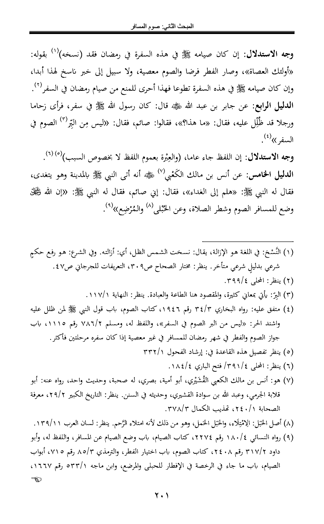 الدليل الخامس: عن أنس بن مالك الكَعْبي (¬7) - رضي الله عنه - أنه أتى النبي - صلى الله عليه وسلم - بالمدينة وهو يتغدى، فقال له النبي - صلى الله عليه وسلم -: «هلم إلى الغداء»، فقال: إني صائم، فقال له النبي - صلى الله عليه وسلم -: «إن الله عز وجل وضع للمسافر الصوم وشطر الصلاة، وعن الحُبْلى (¬8) والمُرْضِع» (¬9).