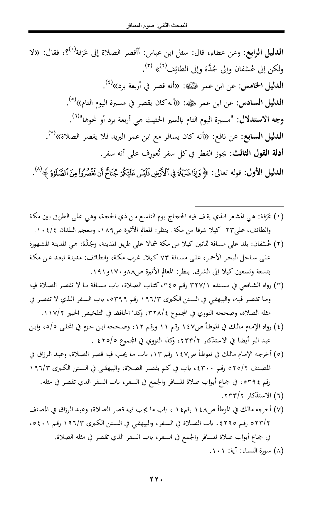 (¬3) رواه الشافعي في مسنده 1/ 327 رقم 345, كتاب الصلاة, باب مسافة ما لا تقصر الصلاة فيه وما تقصر فيه, والبيهقي في السنن الكبرى 3/ 196 رقم 5399, باب السفر الذي لا تقصر في مثله الصلاة, وصححه النووي في المجموع 4/ 328, وكذا الحافظ في التلخيص الحبير 2/ 117.