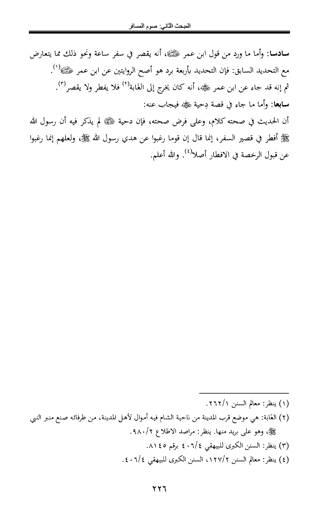 سادسا: وأما ما ورد من قول ابن عمر - رضي الله عنهما -، أنه يقصر في سفر ساعة ونحو ذلك مما يتعارض مع التحديد السابق: فإن التحديد بأربعة برد هو أصح الروايتين عن ابن عمر - رضي الله عنهما - (¬1).