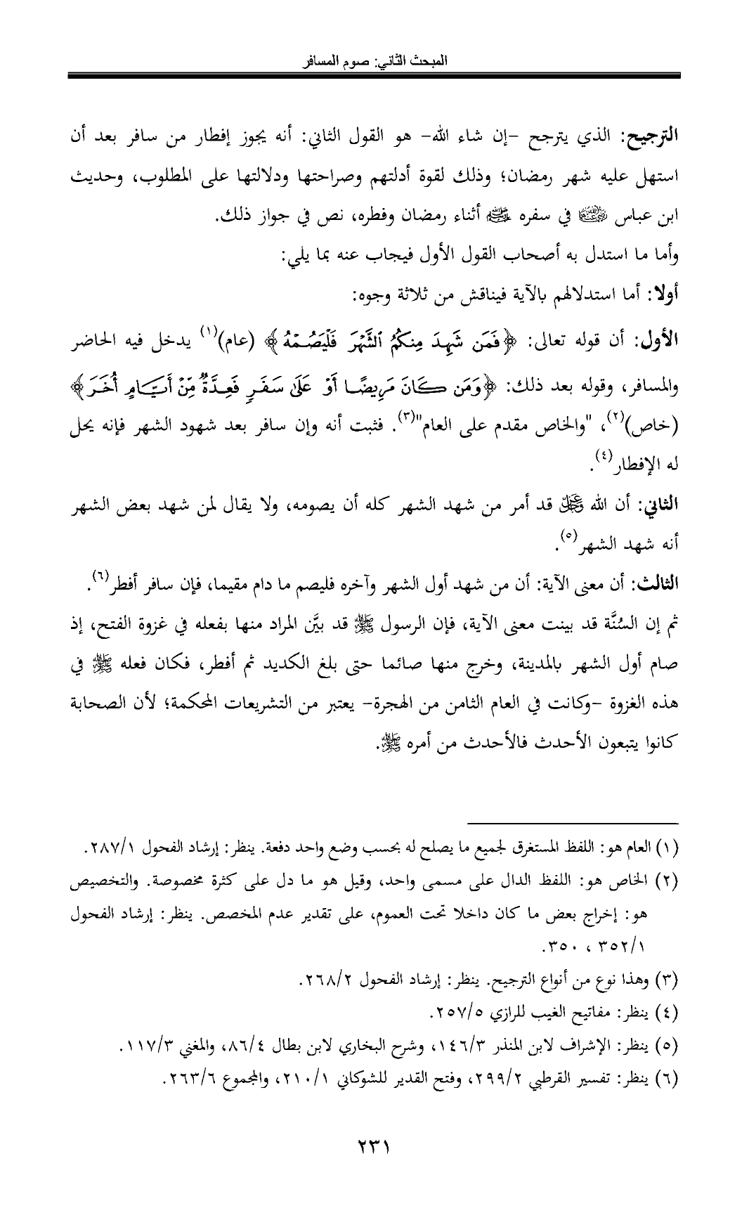الأول: أن قوله تعالى: {فَمَنْ شَهِدَ مِنْكُمُ الشَّهْرَ فَلْيَصُمْهُ} (عام) (¬1) يدخل فيه الحاضر والمسافر، وقوله بعد ذلك: {وَمَنْ كَانَ مَرِيضًا أَوْ عَلَى سَفَرٍ فَعِدَّةٌ مِنْ أَيَّامٍ أُخَرَ} (خاص) (¬2) , "والخاص مقدم على العام" (¬3). فثبت أنه وإن سافر بعد شهود الشهر فإنه يحل له الإفطار (¬4).