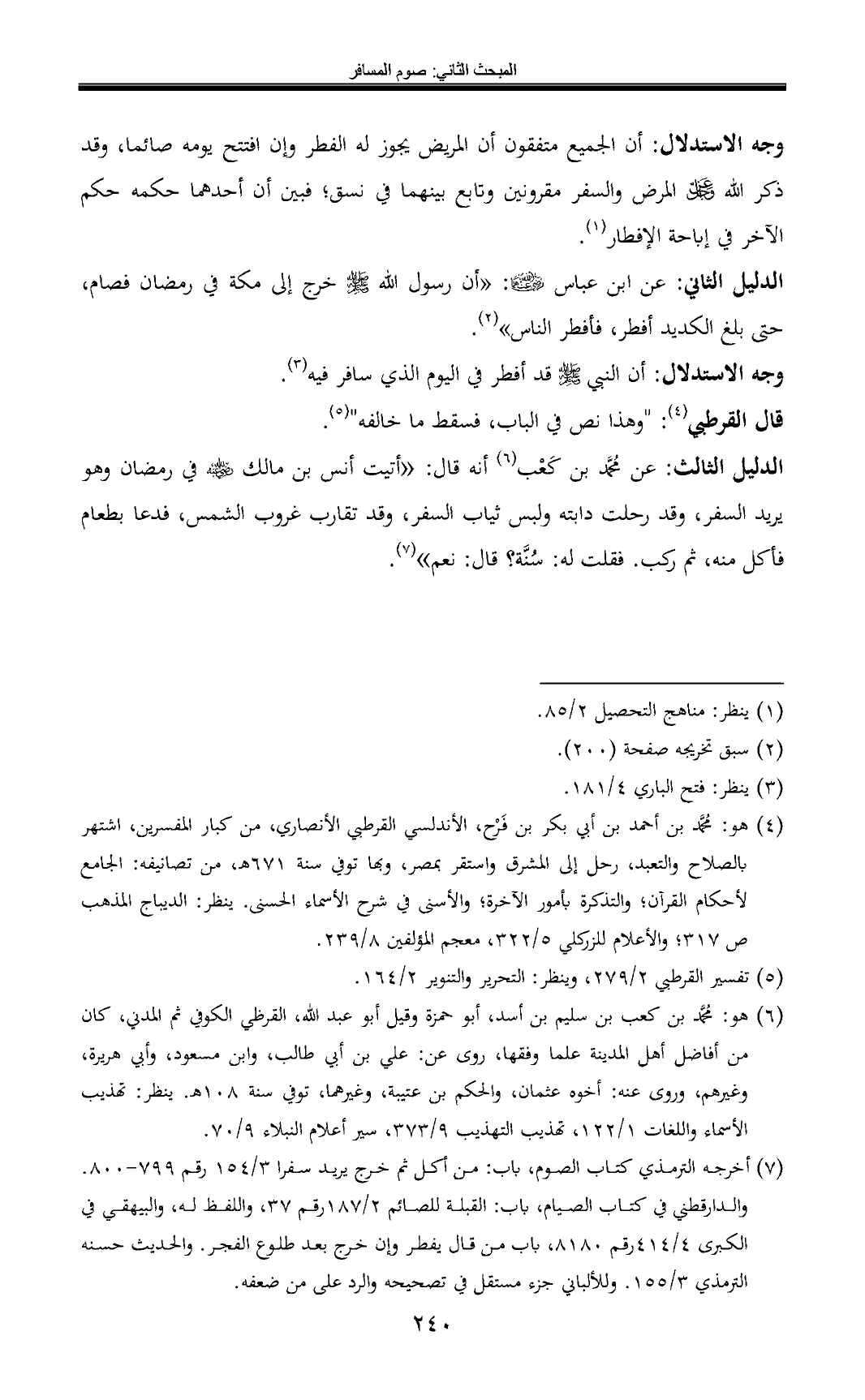 الدليل الثالث: عن محمد بن كَعْب (¬6) أنه قال: «أتيت أنس بن مالك - رضي الله عنه - في رمضان وهو يريد السفر، وقد رحلت دابته ولبس ثياب السفر، وقد تقارب غروب الشمس، فدعا بطعام فأكل منه، ثم ركب. فقلت له: سُنَّة؟ قال: نعم» (¬7).