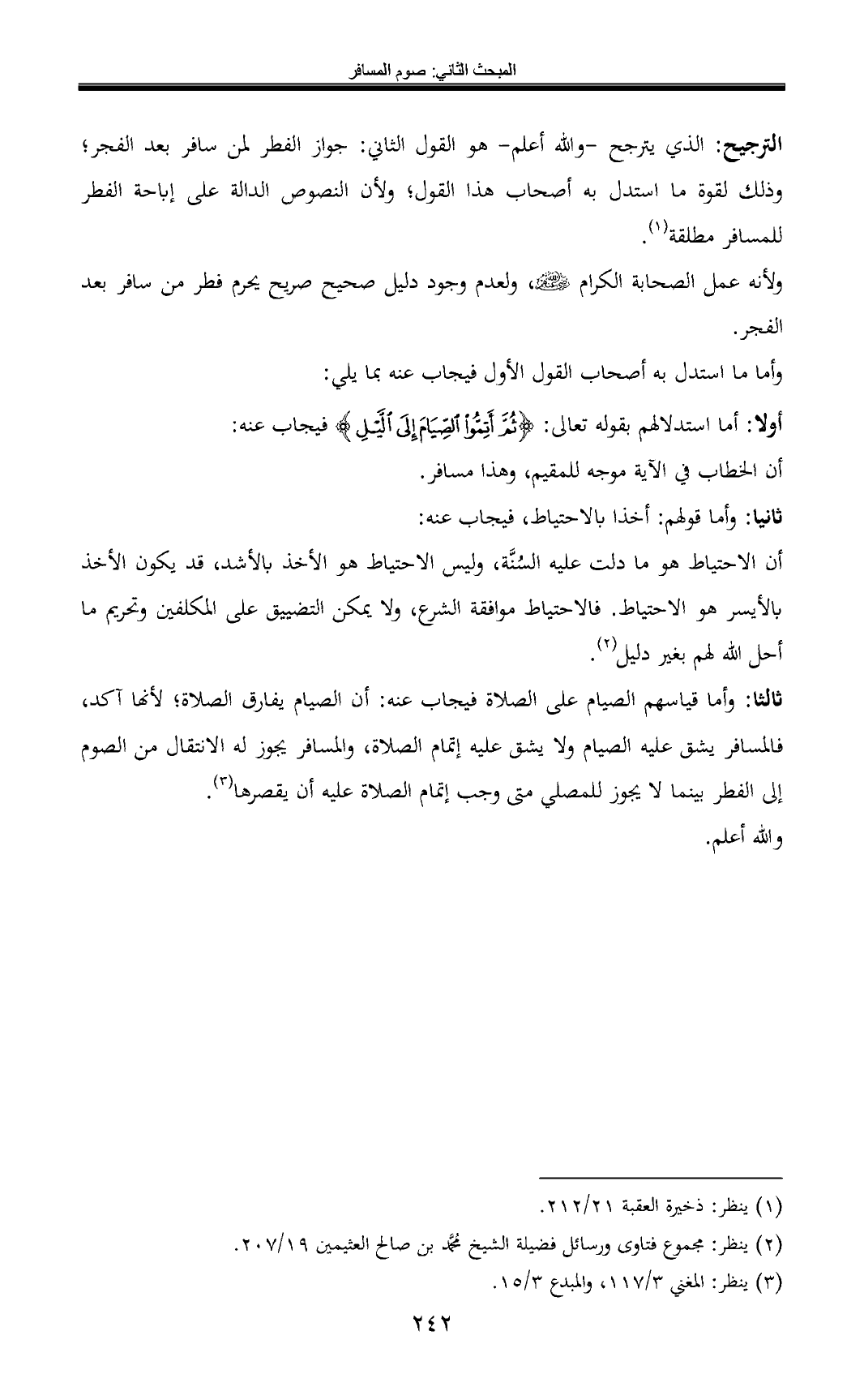 ثالثا: وأما قياسهم الصيام على الصلاة فيجاب عنه: أن الصيام يفارق الصلاة؛ لأنها آكد, فالمسافر يشق عليه الصيام ولا يشق عليه إتمام الصلاة، والمسافر يجوز له الانتقال من الصوم إلى الفطر بينما لا يجوز للمصلي متى وجب إتمام الصلاة عليه أن يقصرها (¬3).