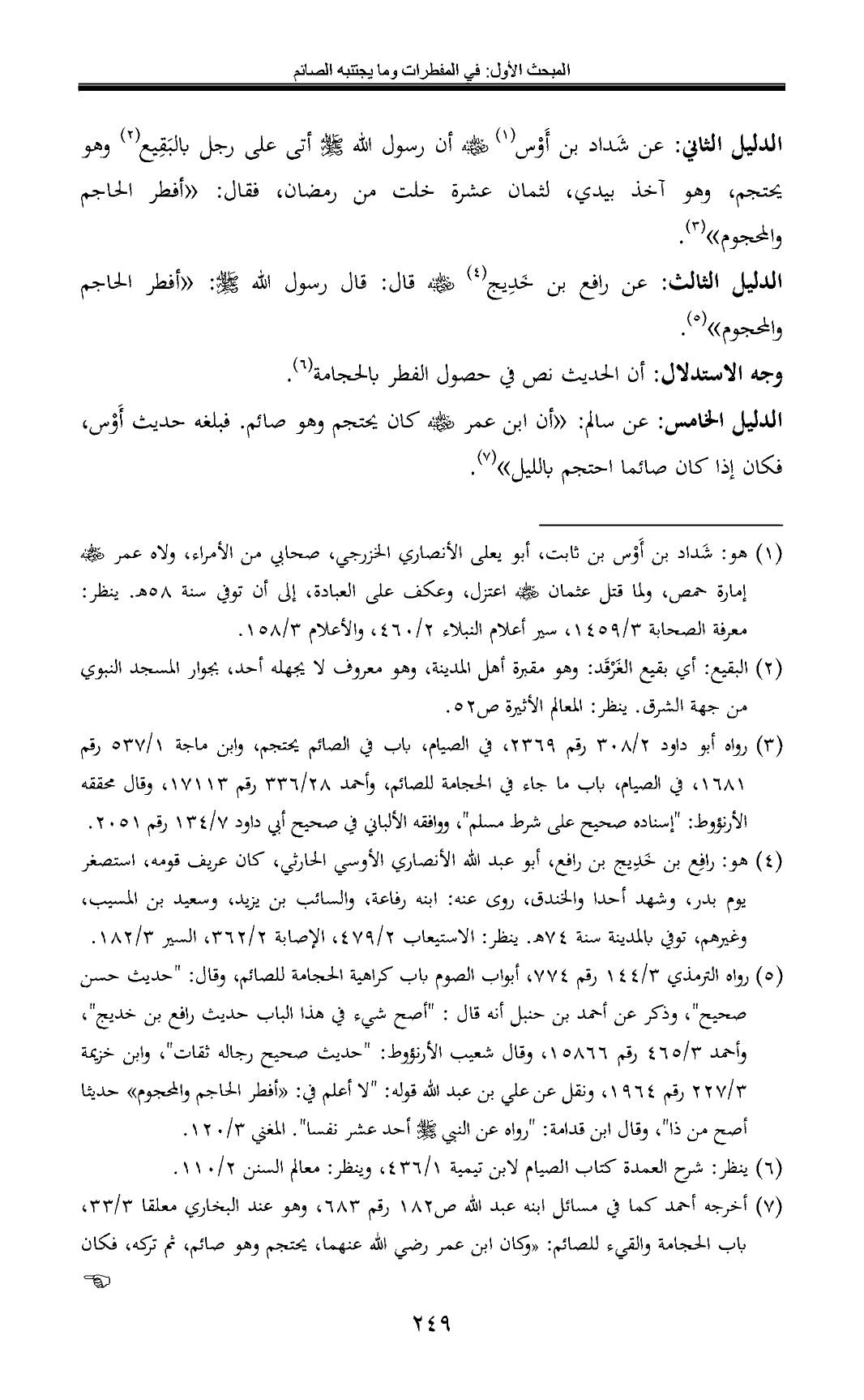 (¬5) رواه الترمذي 3/ 144 رقم 774, أبواب الصوم باب كراهية الحجامة للصائم, وقال: "حديث حسن صحيح", وذكر عن أحمد بن حنبل أنه قال: "أصح شيء في هذا الباب حديث رافع بن خديج", وأحمد 3/ 465 رقم 15866, وقال شعيب الأرنؤوط: "حديث صحيح رجاله ثقات", وابن خزيمة 3/ 227 رقم 1964, ونقل عن علي بن عبد الله قوله: "لا أعلم في: «أفطر الحاجم والمحجوم» حديثا أصح من ذا", وقال ابن قدامة: "رواه عن النبي - صلى الله عليه وسلم - أحد عشر نفسا". المغني 3/ 120.