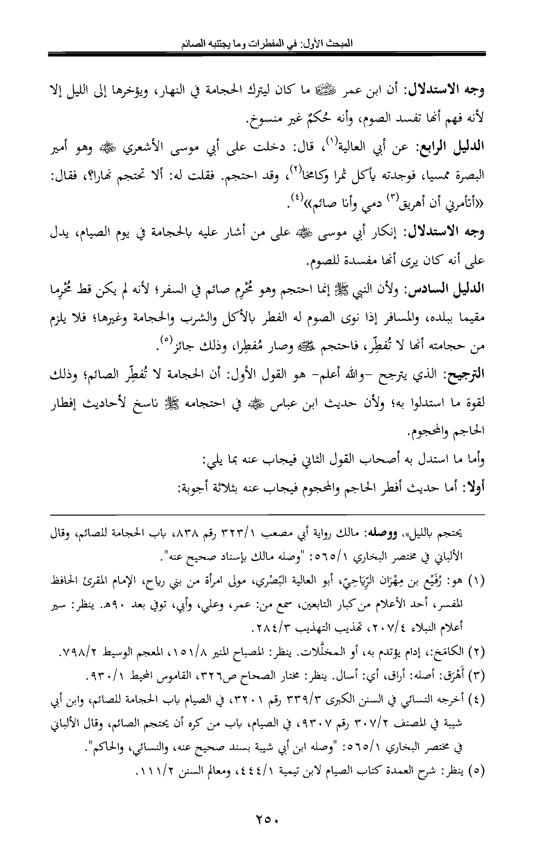 الدليل الرابع: عن أبي العالية (¬1)، قال: دخلت على أبي موسى الأشعري - رضي الله عنه - وهو أمير البصرة ممسيا, فوجدته يأكل ثمرا وكامخا (¬2) , وقد احتجم. فقلت له: ألا تحتجم نهارا؟ , فقال: «أتأمرني أن أهريق (¬3) دمي وأنا صائم» (¬4).