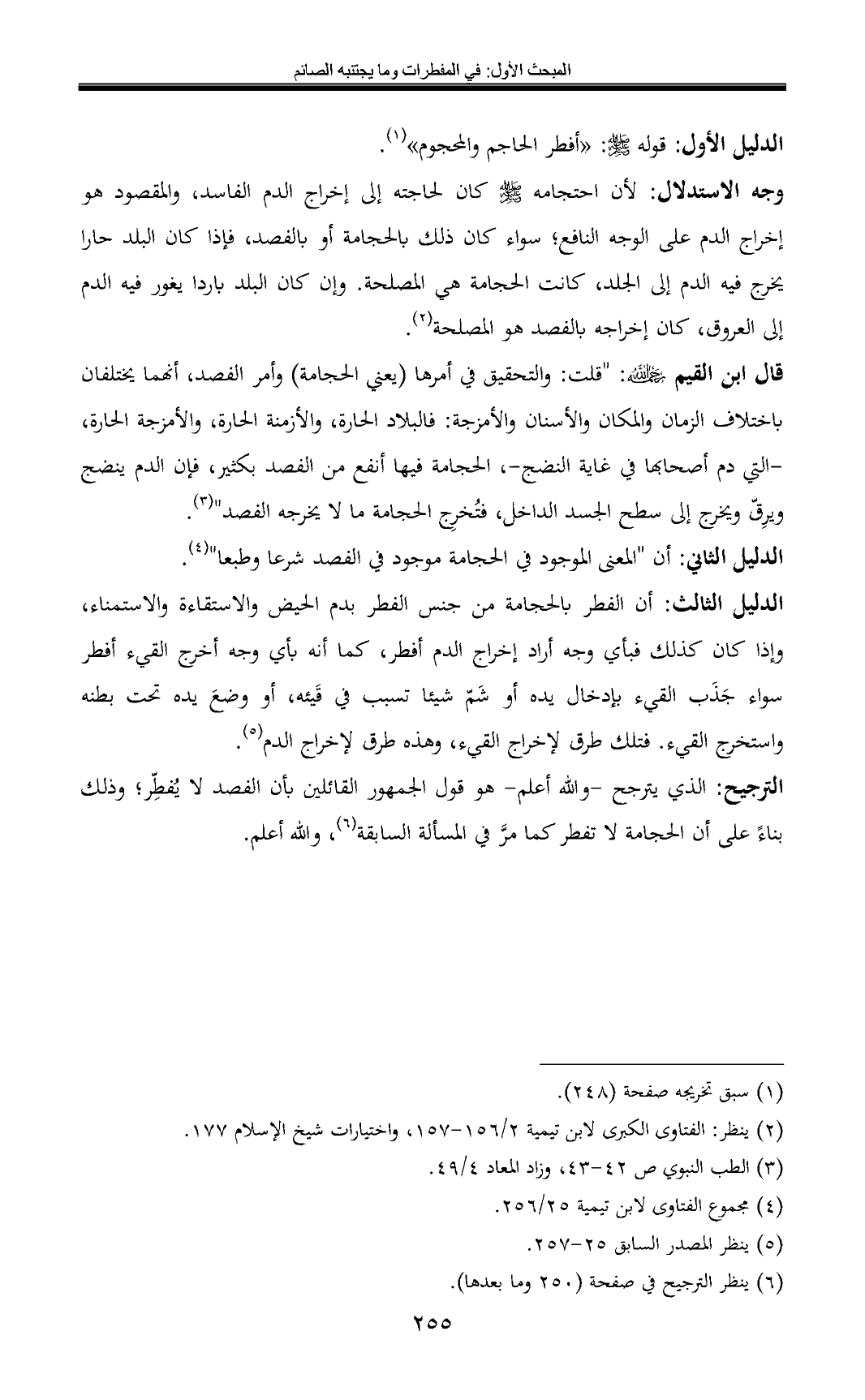 الدليل الثالث: أن الفطر بالحجامة من جنس الفطر بدم الحيض والاستقاءة والاستمناء، وإذا كان كذلك فبأي وجه أراد إخراج الدم أفطر، كما أنه بأي وجه أخرج القيء أفطر سواء جَذَب القيء بإدخال يده أو شَمّ شيئا تسبب في قَيئه، أو وضعَ يده تحت بطنه واستخرج القيء. فتلك طرق لإخراج القيء، وهذه طرق لإخراج الدم (¬5).