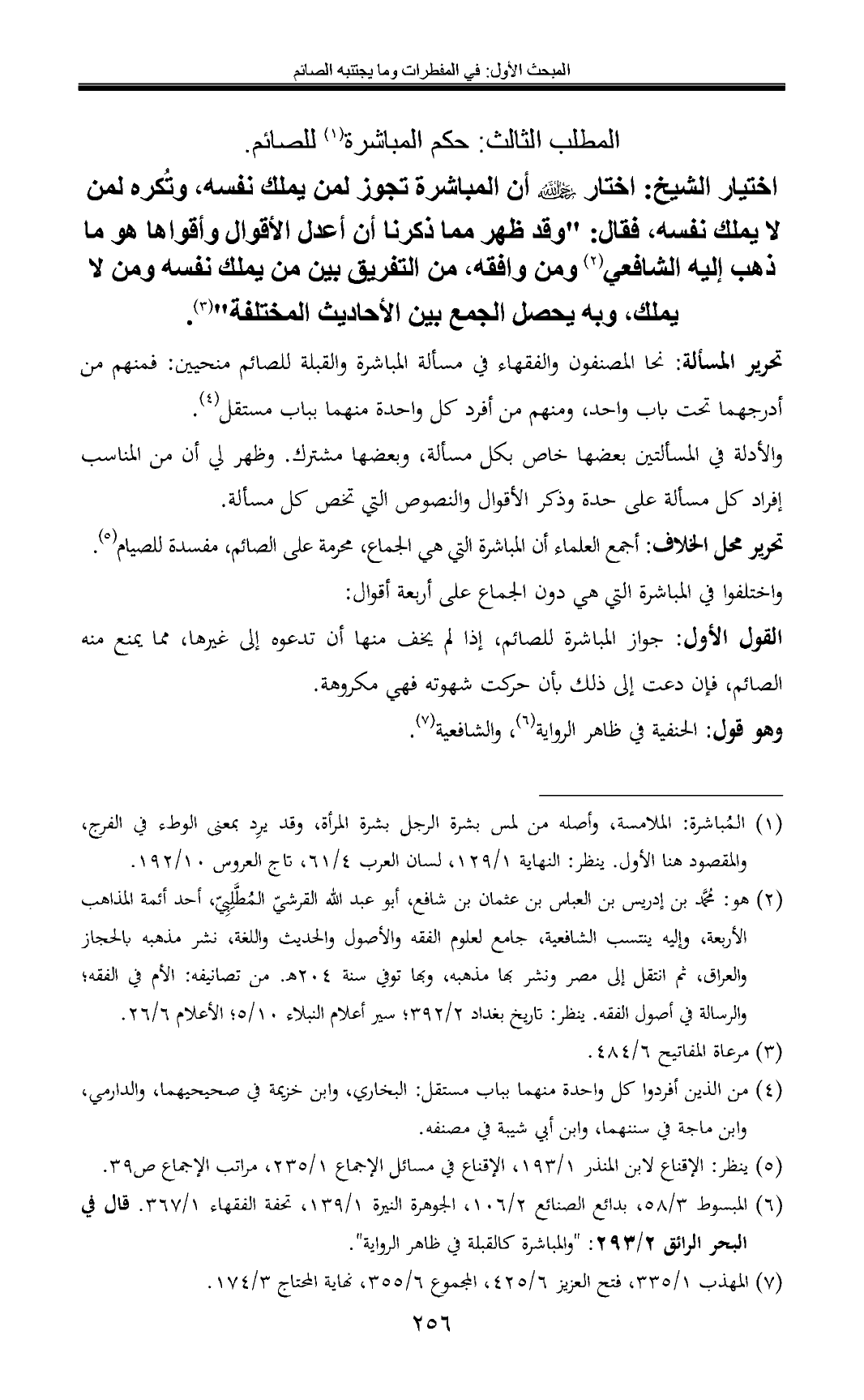 تحرير المسألة: نحا المصنفون والفقهاء في مسألة المباشرة والقبلة للصائم منحيين: فمنهم من أدرجهما تحت باب واحد، ومنهم من أفرد كل واحدة منهما بباب مستقل (¬4).
