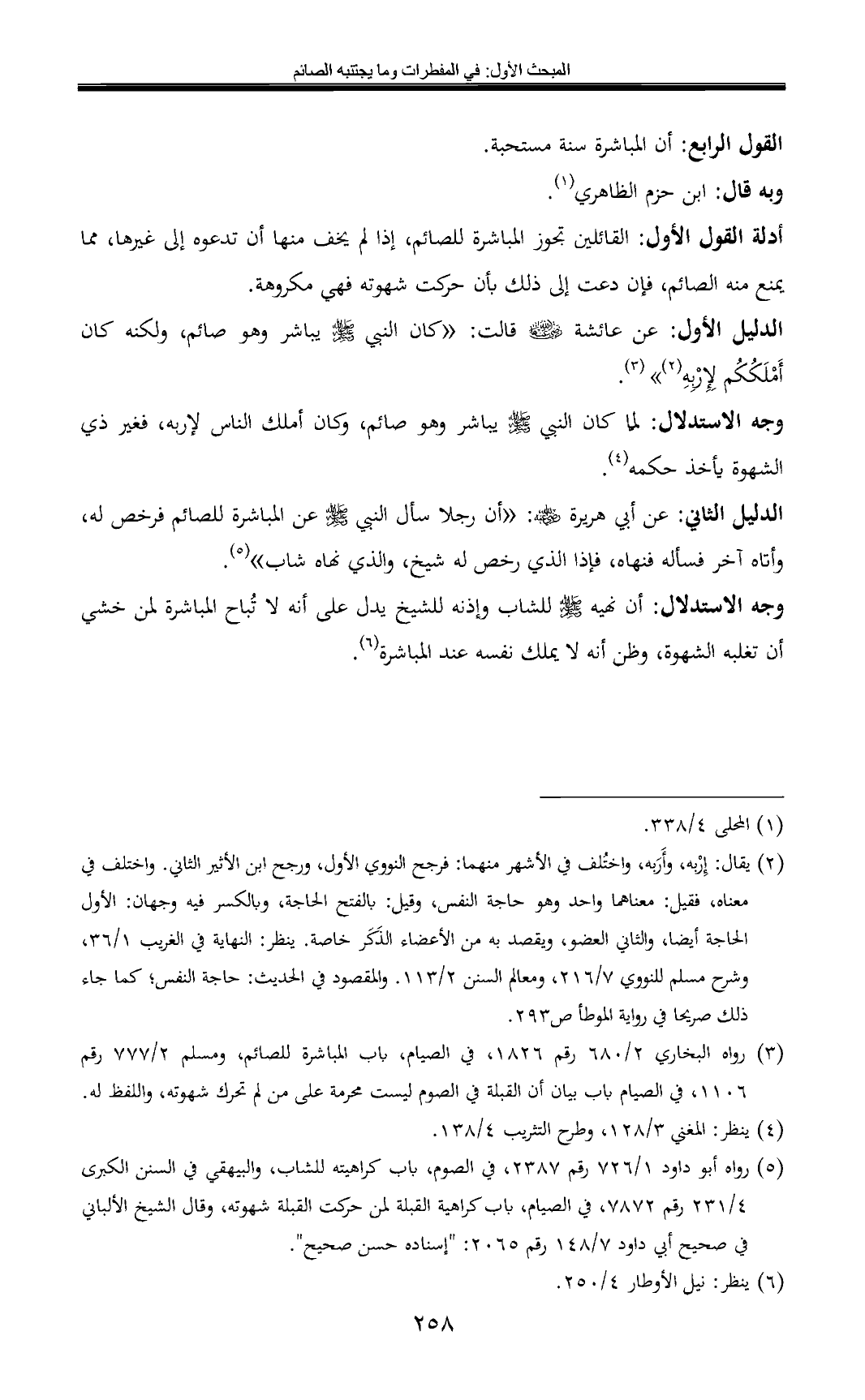 (¬5) رواه أبو داود 1/ 726 رقم 2387, في الصوم, باب كراهيته للشاب, والبيهقي في السنن الكبرى 4/ 231 رقم 7872, في الصيام, باب كراهية القبلة لمن حركت القبلة شهوته, وقال الشيخ الألباني في صحيح أبي داود 7/ 148 رقم 2065: "إسناده حسن صحيح".