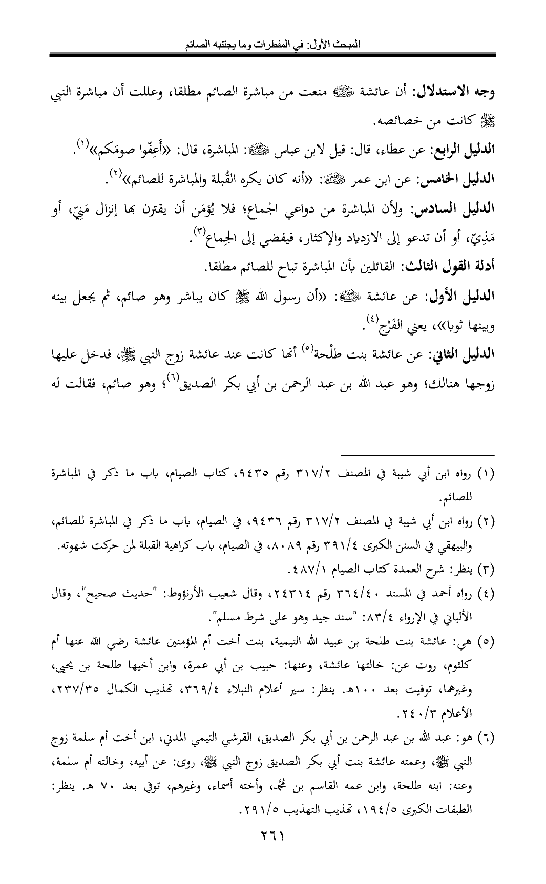 الدليل الثاني: عن عائشة بنت طلْحة (¬5) أنها كانت عند عائشة زوج النبي - صلى الله عليه وسلم -، فدخل عليها زوجها هنالك؛ وهو عبد الله بن عبد الرحمن بن أبي بكر الصديق (¬6)؛ وهو صائم، فقالت له