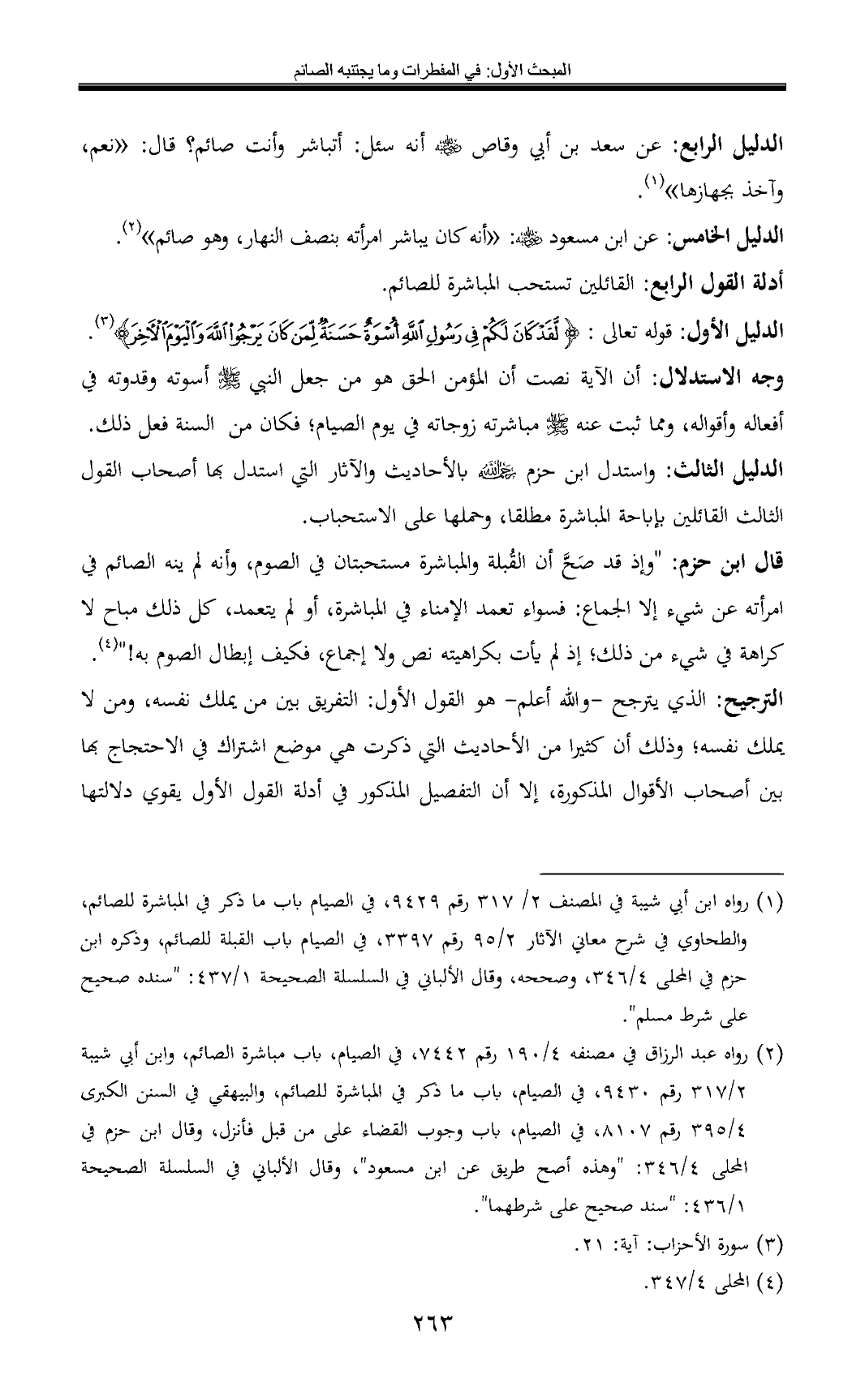 الدليل الرابع: عن سعد بن أبي وقاص - رضي الله عنه - أنه سئل: أتباشر وأنت صائم؟ قال: «نعم، وآخذ بجهازها» (¬1).