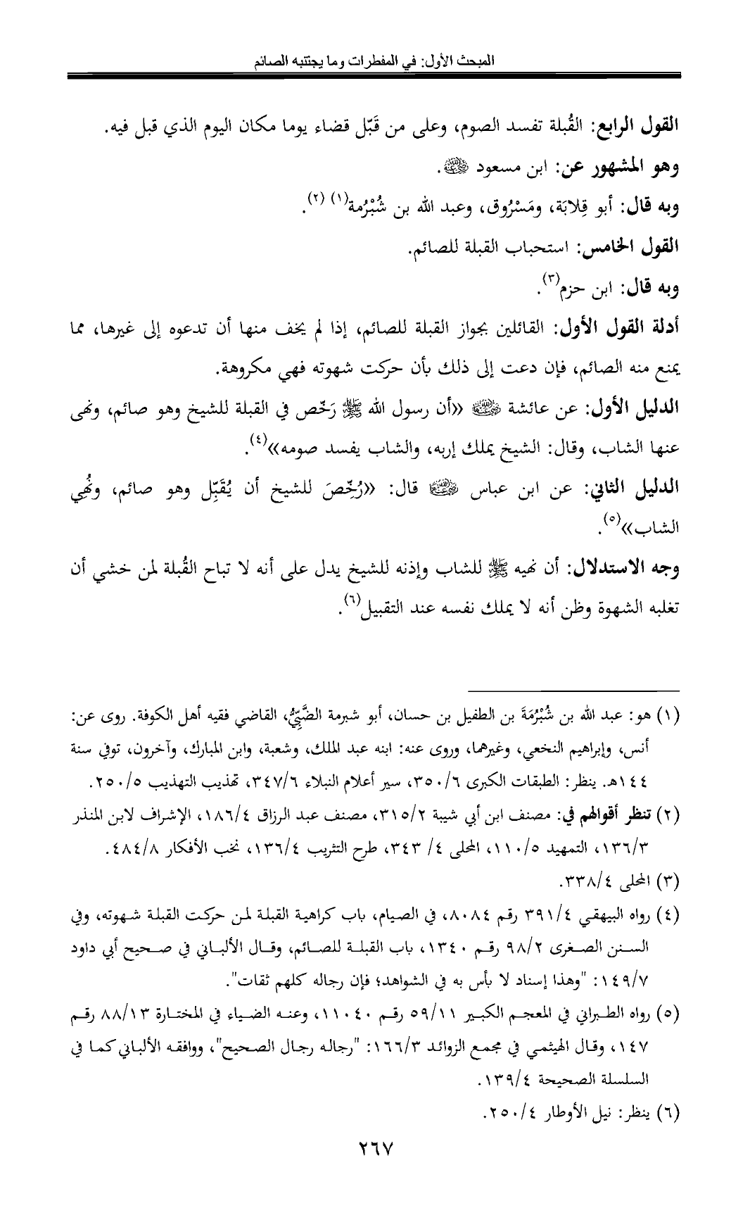 (¬4) رواه البيهقي 4/ 391 رقم 8084, في الصيام, باب كراهية القبلة لمن حركت القبلة شهوته, وفي السنن الصغرى 2/ 98 رقم 1340, باب القبلة للصائم, وقال الألباني في صحيح أبي داود 7/ 149: "وهذا إسناد لا بأس به في الشواهد؛ فإن رجاله كلهم ثقات".