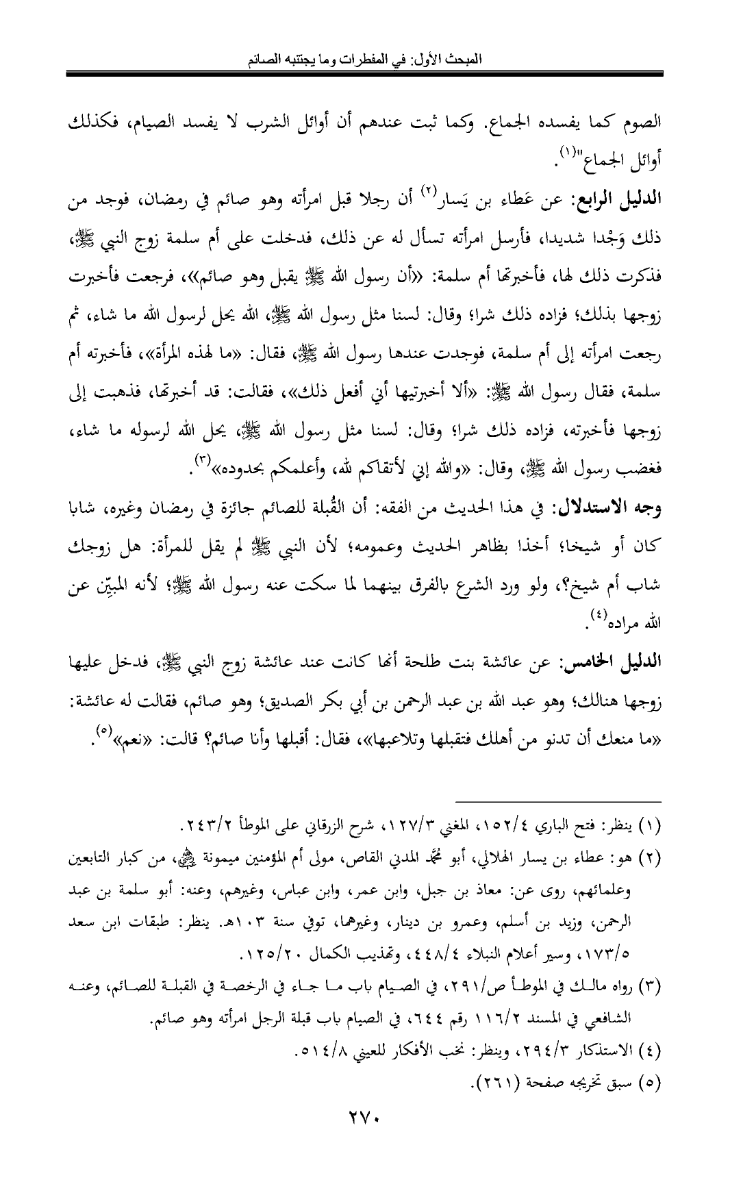 الدليل الرابع: عن عَطاء بن يَسار (¬2) أن رجلا قبل امرأته وهو صائم في رمضان، فوجد من ذلك وَجْدا شديدا، فأرسل امرأته تسأل له عن ذلك، فدخلت على أم سلمة زوج النبي - صلى الله عليه وسلم -، فذكرت ذلك لها، فأخبرتها أم سلمة: «أن رسول الله - صلى الله عليه وسلم - يقبل وهو صائم»، فرجعت فأخبرت زوجها بذلك؛ فزاده ذلك شرا؛ وقال: لسنا مثل رسول الله - صلى الله عليه وسلم -، الله يحل لرسول الله ما شاء، ثم رجعت امرأته إلى أم سلمة، فوجدت عندها رسول الله - صلى الله عليه وسلم -، فقال: «ما لهذه المرأة»، فأخبرته أم سلمة، فقال رسول الله - صلى الله عليه وسلم -: «ألا أخبرتيها أني أفعل ذلك»، فقالت: قد أخبرتها، فذهبت إلى زوجها فأخبرته، فزاده ذلك شرا؛ وقال: لسنا مثل رسول الله - صلى الله عليه وسلم - , يحل الله لرسوله ما شاء، فغضب رسول الله - صلى الله عليه وسلم -، وقال: «والله إني لأتقاكم لله، وأعلمكم بحدوده» (¬3).