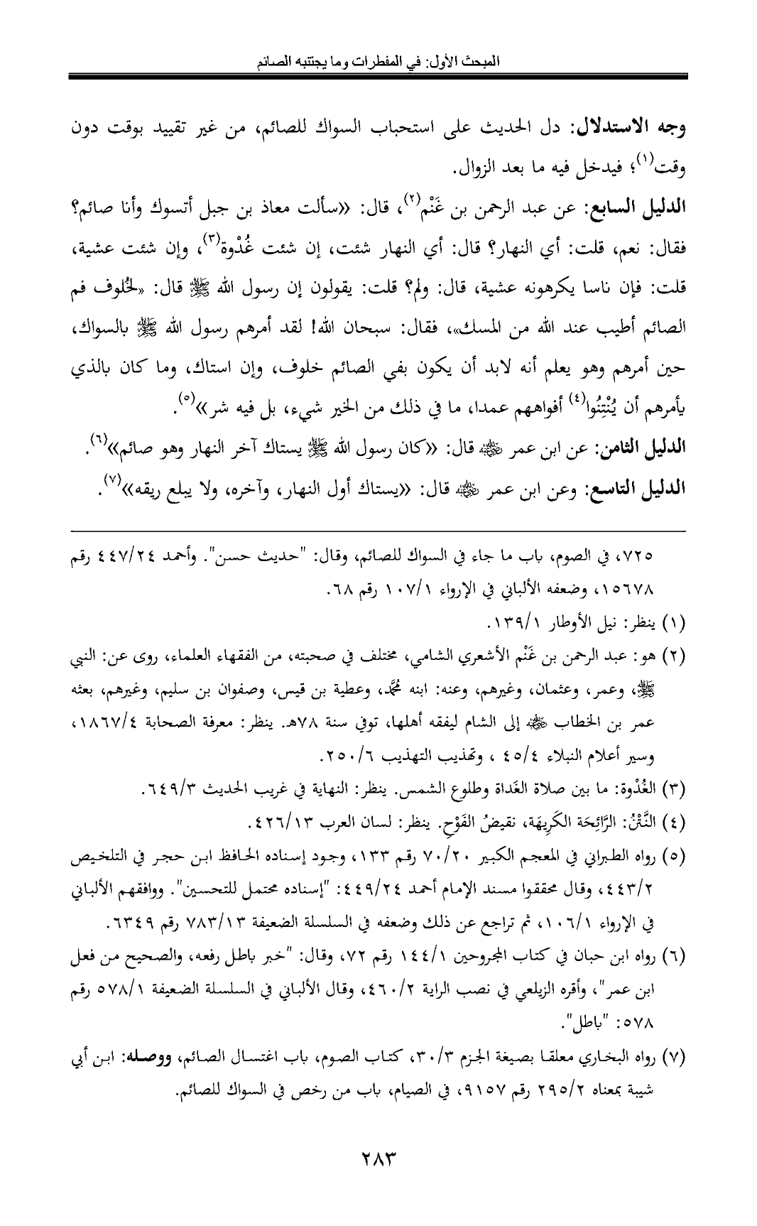 الدليل السابع: عن عبد الرحمن بن غَنْم (¬2)، قال: «سألت معاذ بن جبل أتسوك وأنا صائم؟ فقال: نعم، قلت: أي النهار؟ قال: أي النهار شئت، إن شئت غُدْوة (¬3)، وإن شئت عشية، قلت: فإن ناسا يكرهونه عشية، قال: ولم؟ قلت: يقولون إن رسول الله - صلى الله عليه وسلم - قال: «لخُلوف فم الصائم أطيب عند الله من المسك» , فقال: سبحان الله! لقد أمرهم رسول الله - صلى الله عليه وسلم - بالسواك، حين أمرهم وهو يعلم أنه لابد أن يكون بفي الصائم خلوف، وإن استاك، وما كان بالذي يأمرهم أن يُنْتِنُوا (¬4) أفواههم عمدا، ما في ذلك من الخير شيء، بل فيه شر» (¬5).