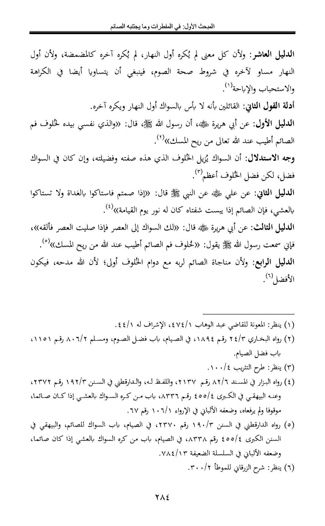 (¬5) رواه الدارقطني في السنن 3/ 190 رقم 2370, في الصيام, باب السواك للصائم, والبيهقي في السنن الكبرى 4/ 455 رقم 8338, في الصيام, باب من كره السواك بالعشي إذا كان صائما, وضعفه الألباني في السلسلة الضعيفة 13/ 784.