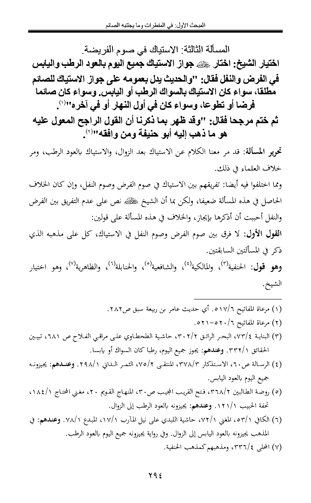 (¬4) الرسالة ص 60, الاستذكار 3/ 378, المنتقى 2/ 75, الثمر الداني 1/ 298. وعندهم: يجيزونه جميع اليوم بالعود اليابس.