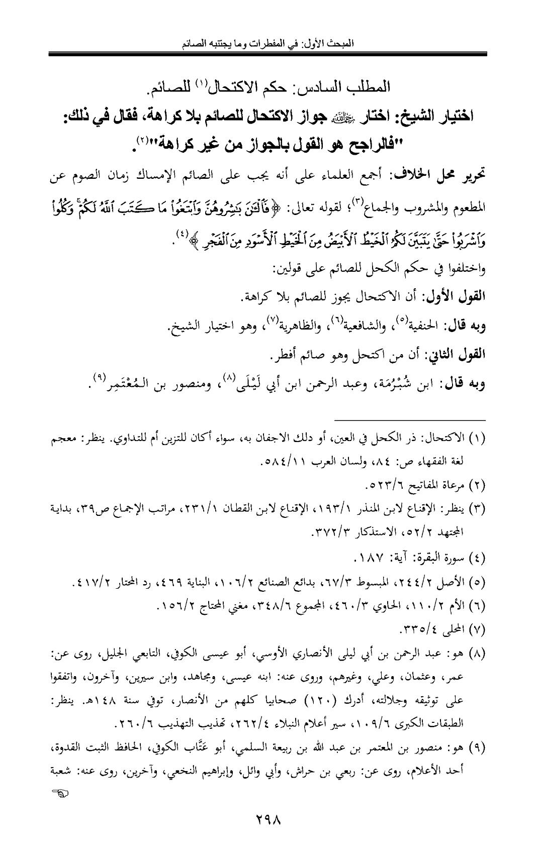 اختيار الشيخ: اختار جواز الاكتحال للصائم بلا كراهة، فقال في ذلك: "فالراجح هو القول بالجواز من غير كراهة" (¬2).