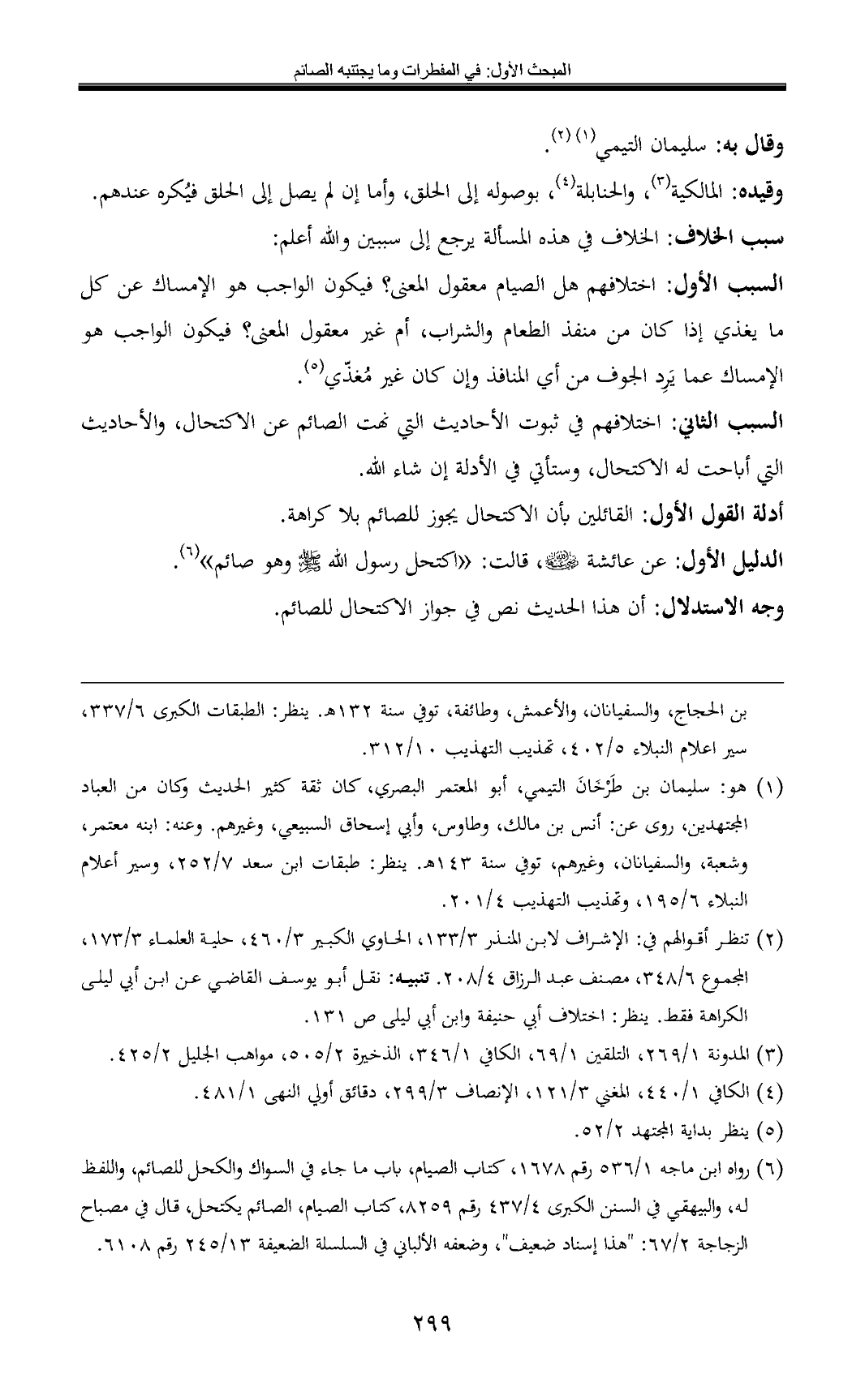 (¬6) رواه ابن ماجه 1/ 536 رقم 1678, كتاب الصيام, باب ما جاء في السواك والكحل للصائم, واللفظ له, والبيهقي في السنن الكبرى 4/ 437 رقم 8259, كتاب الصيام, الصائم يكتحل, قال في مصباح الزجاجة 2/ 67: "هذا إسناد ضعيف", وضعفه الألباني في السلسلة الضعيفة 13/ 245 رقم 6108.