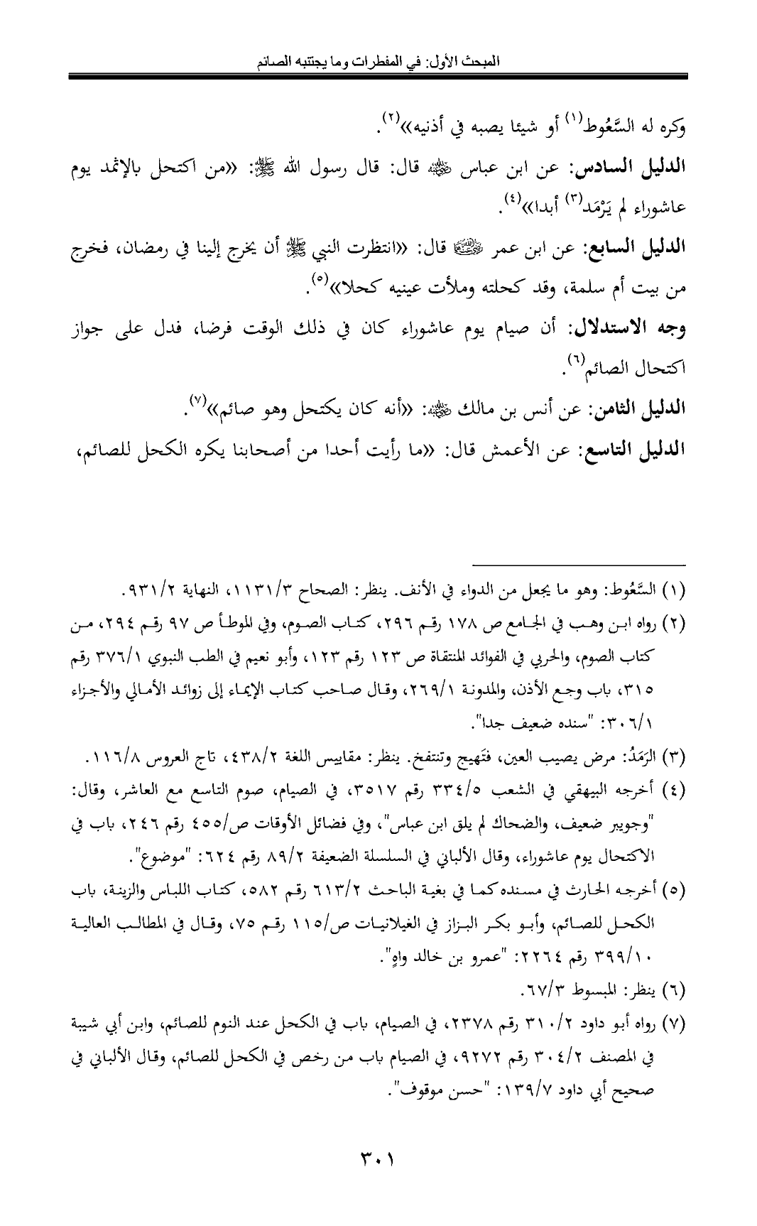 (¬7) رواه أبو داود 2/ 310 رقم 2378, في الصيام, باب في الكحل عند النوم للصائم, وابن أبي شيبة في المصنف 2/ 304 رقم 9272, في الصيام باب من رخص في الكحل للصائم, وقال الألباني في صحيح أبي داود 7/ 139: "حسن موقوف".
