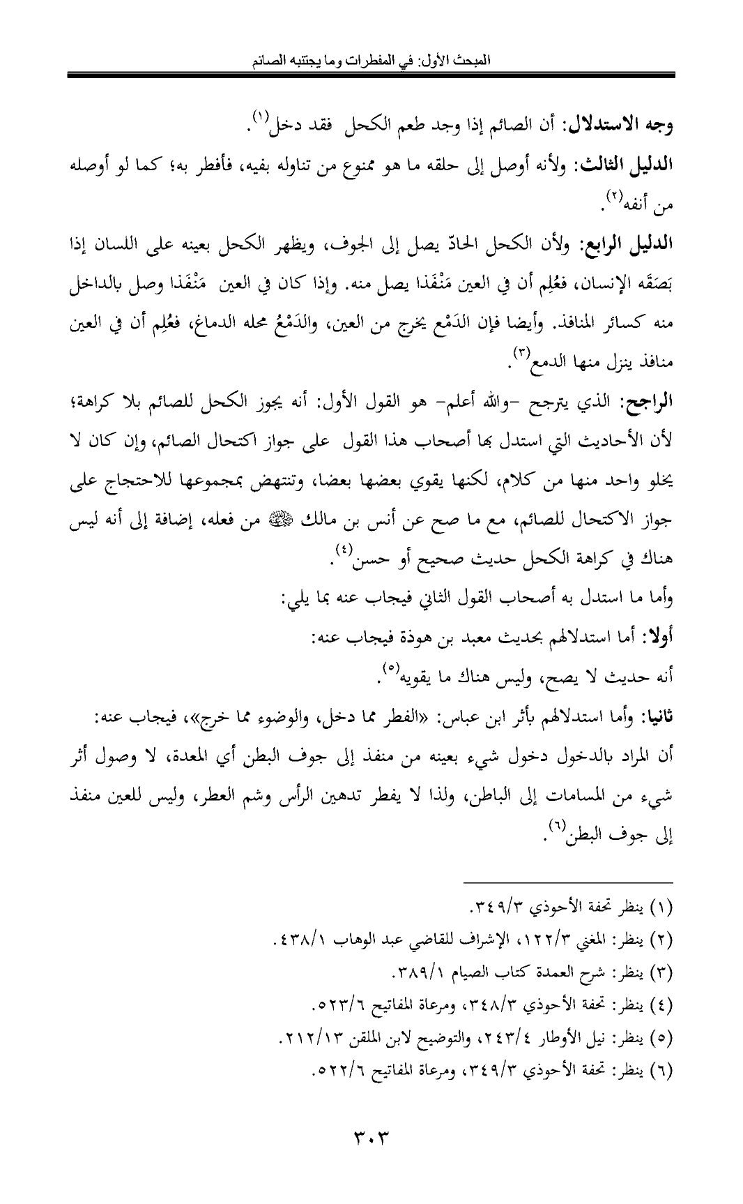 الراجح: الذي يترجح -والله أعلم- هو القول الأول: أنه يجوز الكحل للصائم بلا كراهة؛ لأن الأحاديث التي استدل بها أصحاب هذا القول على جواز اكتحال الصائم، وإن كان لا يخلو واحد منها من كلام، لكنها يقوي بعضها بعضا, وتنتهض بمجموعها للاحتجاج على جواز الاكتحال للصائم، مع ما صح عن أنس بن مالك ¢ من فعله, إضافة إلى أنه ليس هناك في كراهة الكحل حديث صحيح أو حسن (¬4).
