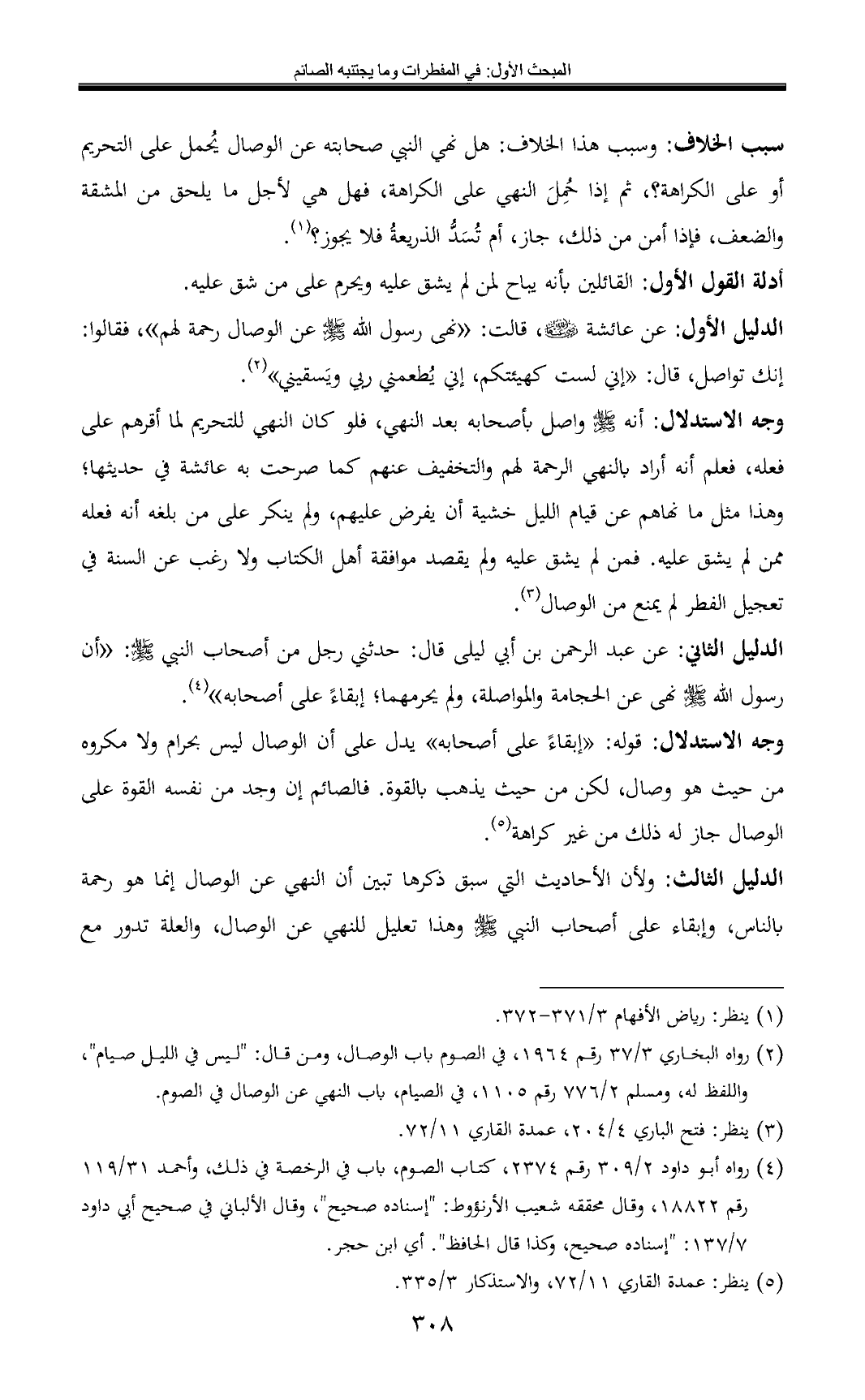 وجه الاستدلال: أنه - صلى الله عليه وسلم - واصل بأصحابه بعد النهي، فلو كان النهي للتحريم لما أقرهم على فعله، فعلم أنه أراد بالنهي الرحمة لهم والتخفيف عنهم كما صرحت به عائشة في حديثها؛ وهذا مثل ما نهاهم عن قيام الليل خشية أن يفرض عليهم، ولم ينكر على من بلغه أنه فعله ممن لم يشق عليه. فمن لم يشق عليه ولم يقصد موافقة أهل الكتاب ولا رغب عن السنة في تعجيل الفطر لم يمنع من الوصال (¬3).