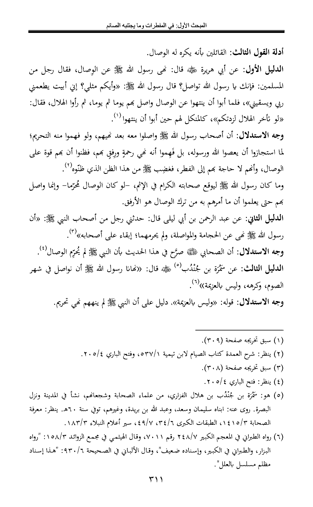 الدليل الثالث: عن سَمُرَة بن جُنْدُب (¬5) - رضي الله عنه - قال: «نهانا رسول الله - صلى الله عليه وسلم - أن نواصل في شهر الصوم، وكرهه، وليس بالعزيمة» (¬6).