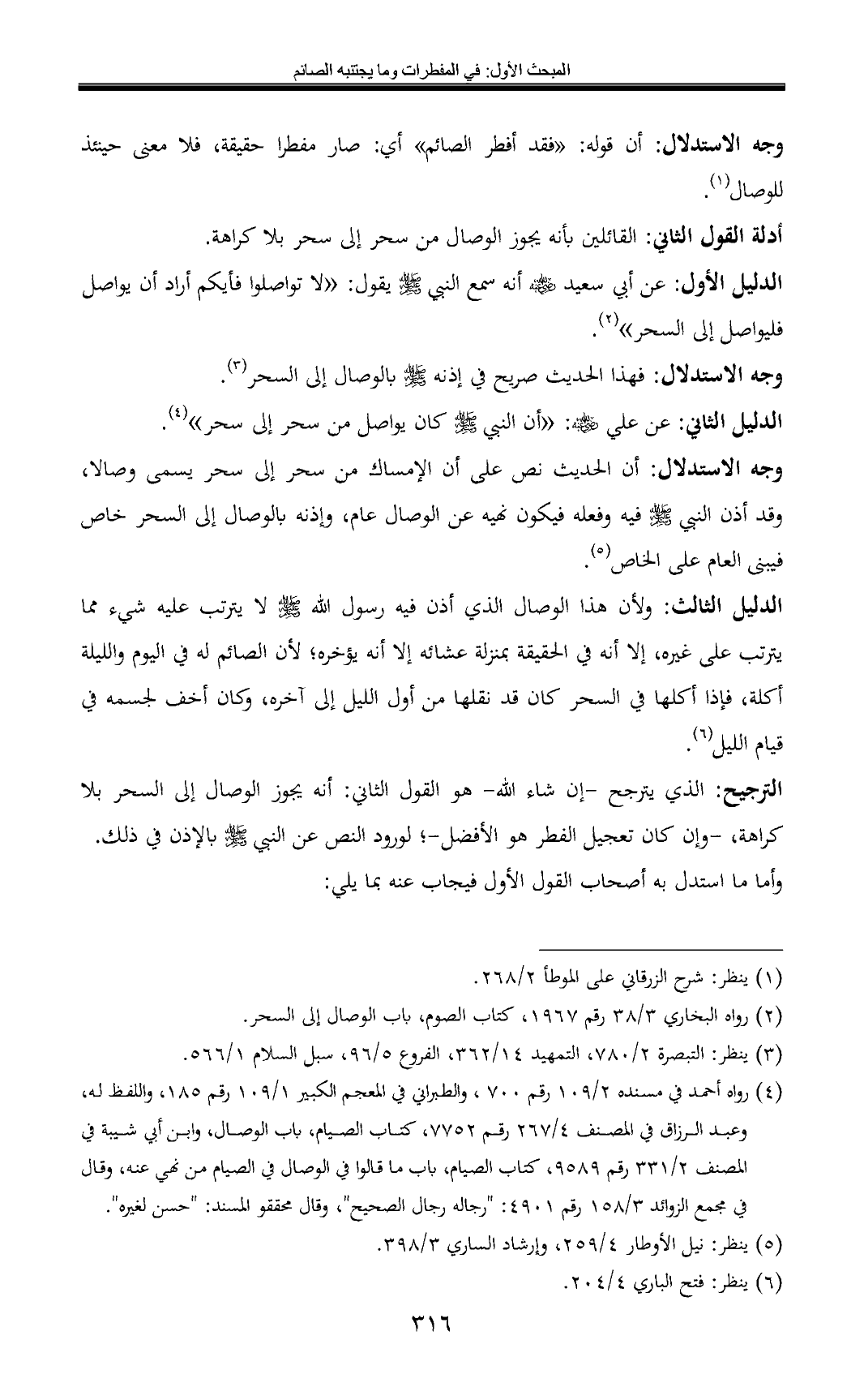 وجه الاستدلال: أن الحديث نص على أن الإمساك من سحر إلى سحر يسمى وصالا، وقد أذن النبي - صلى الله عليه وسلم - فيه وفعله فيكون نهيه عن الوصال عام، وإذنه بالوصال إلى السحر خاص فيبنى العام على الخاص (¬5).