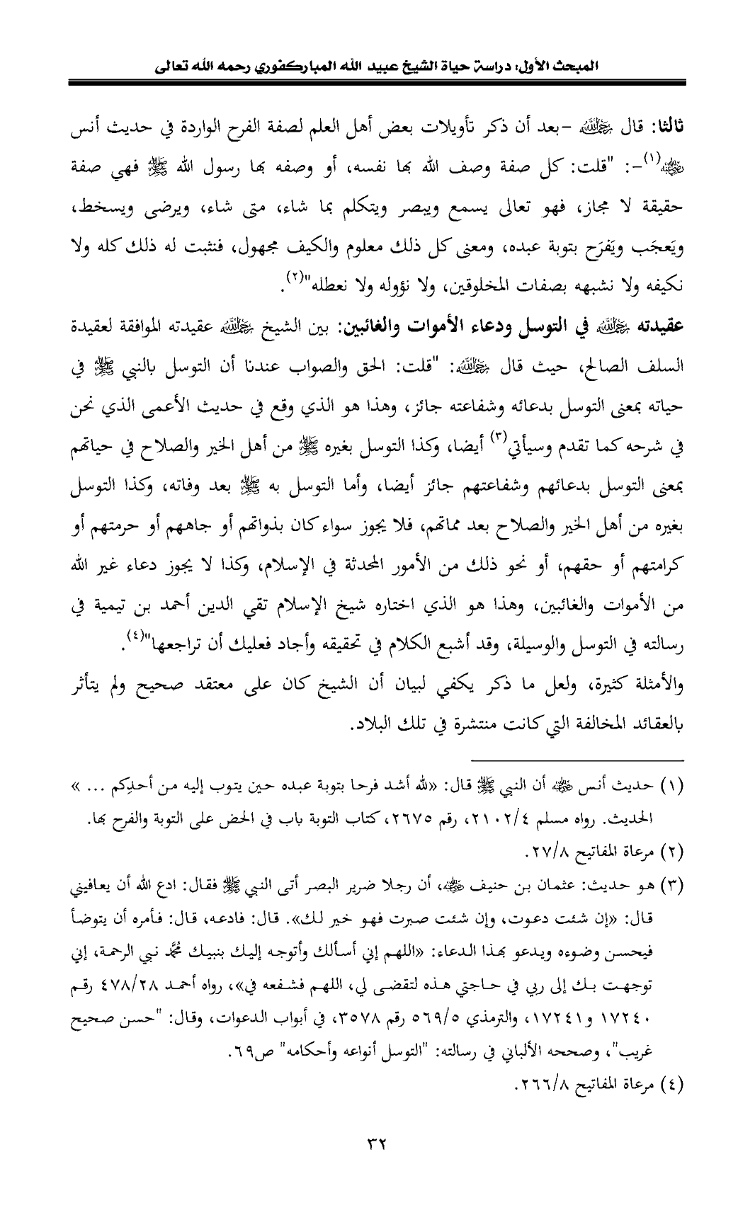 (¬3) هو حديث: عثمان بن حنيف - رضي الله عنه -، أن رجلا ضرير البصر أتى النبي - صلى الله عليه وسلم - فقال: ادع الله أن يعافيني قال: «إن شئت دعوت، وإن شئت صبرت فهو خير لك». قال: فادعه، قال: فأمره أن يتوضأ فيحسن وضوءه ويدعو بهذا الدعاء: «اللهم إني أسألك وأتوجه إليك بنبيك محمد نبي الرحمة، إني توجهت بك إلى ربي في حاجتي هذه لتقضى لي، اللهم فشفعه في» , رواه أحمد 28/ 478 رقم 17240 و 17241, والترمذي 5/ 569 رقم 3578, في أبواب الدعوات, وقال: "حسن صحيح غريب", وصححه الألباني في رسالته: "التوسل أنواعه وأحكامه" ص 69.