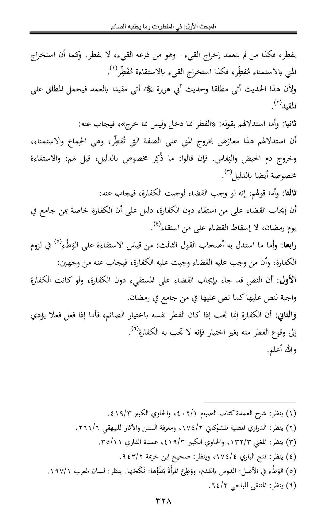 أن استدلالهم هذا معارَض بخروج المني على الصفة التي تُفطِّر، وهي الجِماع والاستمناء، وخروج دم الحيض والنِفاس. فإن قالوا: ما ذُكِر مخصوص بالدليل، قيل لهم: والاستقاءة مخصوصة أيضا بالدليل (¬3).