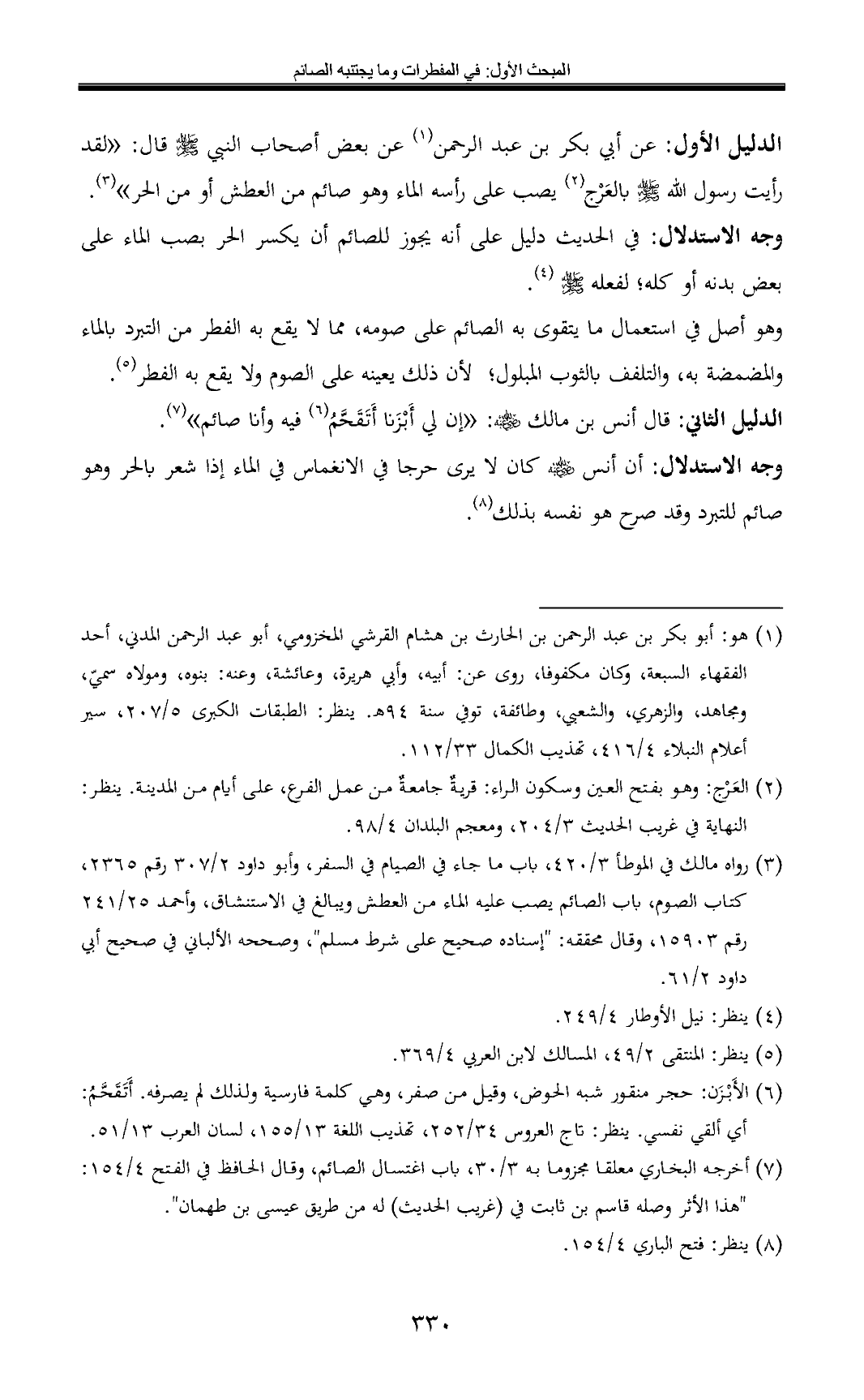 الدليل الأول: عن أبي بكر بن عبد الرحمن (¬1) عن بعض أصحاب النبي - صلى الله عليه وسلم - قال: «لقد رأيت رسول الله - صلى الله عليه وسلم - بالعَرْج (¬2) يصب على رأسه الماء وهو صائم من العطش أو من الحر» (¬3).