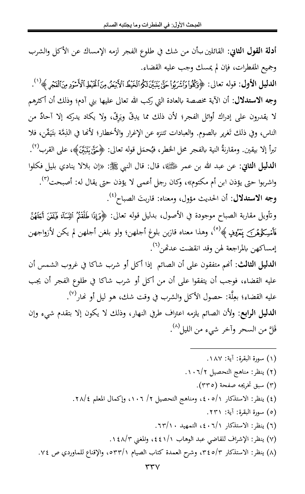 الدليل الأول: قوله تعالى: {وَكُلُوا وَاشْرَبُوا حَتَّى يَتَبَيَّنَ لَكُمُ الْخَيْطُ الْأَبْيَضُ مِنَ الْخَيْطِ الْأَسْوَدِ مِنَ الْفَجْرِ} (¬1).