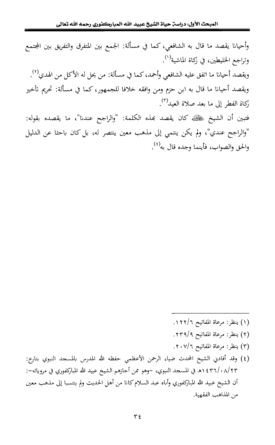 (¬4) وقد أفادني الشيخ المحدث ضياء الرحمن الأعظمي حفظه الله المدرس بالمسجد النبوي بتارخ: 23/ 08/1436 هـ في المسجد النبوي، -وهو ممن أجازهم الشيخ عبيد الله المباركفوري في مروياته-: أن الشيخ عبيد الله المباركفوري وأباه عبد السلام كانا من أهل الحديث ولم ينتسبا إلى مذهب معين من المذاهب الفقهية.