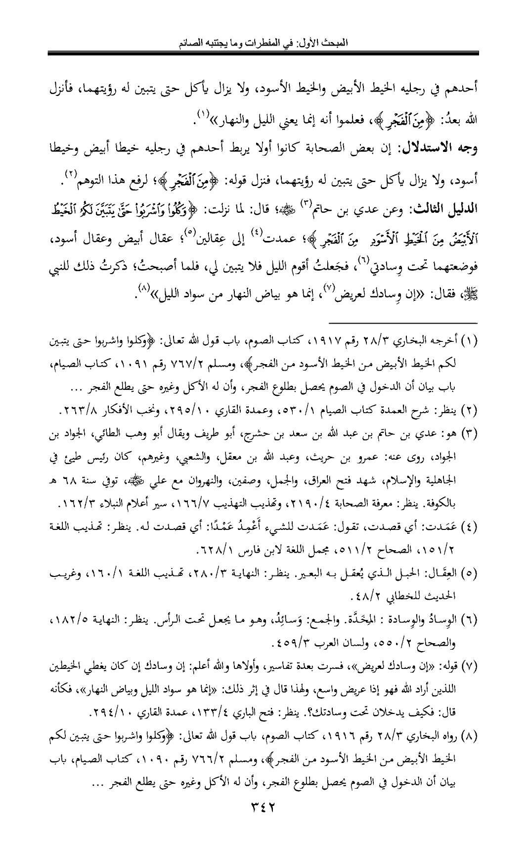 (¬8) رواه البخاري 3/ 28 رقم 1916, كتاب الصوم, باب قول الله تعالى: {وكلوا واشربوا حتى يتبين لكم الخيط الأبيض من الخيط الأسود من الفجر} , ومسلم 2/ 766 رقم 1090, كتاب الصيام, باب بيان أن الدخول في الصوم يحصل بطلوع الفجر، وأن له الأكل وغيره حتى يطلع الفجر ...