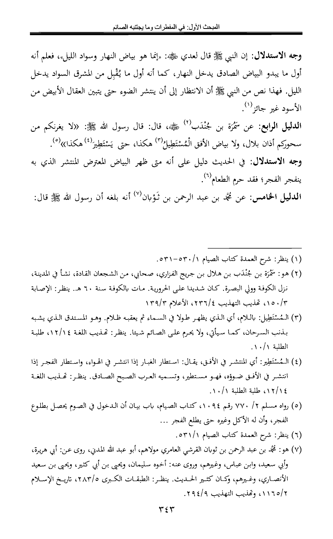 الدليل الرابع: عن سَمُرَة بن جُنْدَب (¬2) - رضي الله عنه -، قال: قال رسول الله - صلى الله عليه وسلم -: «لا يغرنكم من سحوركم أذان بلال، ولا بياض الأفق الْمُسْتَطِيلُ (¬3) هكذا، حتى يَسْتَطِيرَ (¬4) هكذا» (¬5).