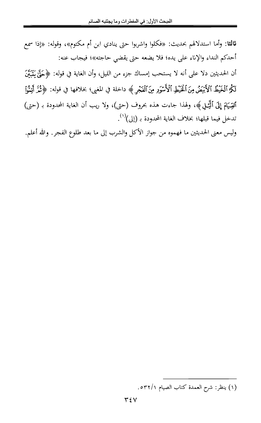 أن الحديثين دلا على أنه لا يستحب إمساك جزء من الليل, وأن الغاية في قوله: {حَتَّى يَتَبَيَّنَ لَكُمُ الْخَيْطُ الْأَبْيَضُ مِنَ الْخَيْطِ الْأَسْوَدِ مِنَ الْفَجْرِ} داخلة في المغيى؛ بخلافها في قوله: {ثُمَّ أَتِمُّوا الصِّيَامَ إِلَى اللَّيْلِ} , ولهذا جاءت هذه بحروف (حتى) , ولا ريب أن الغاية المحدودة بـ (حتى) تدخل فيما قبلها؛ بخلاف الغاية المحدودة بـ (إلى) (¬1).