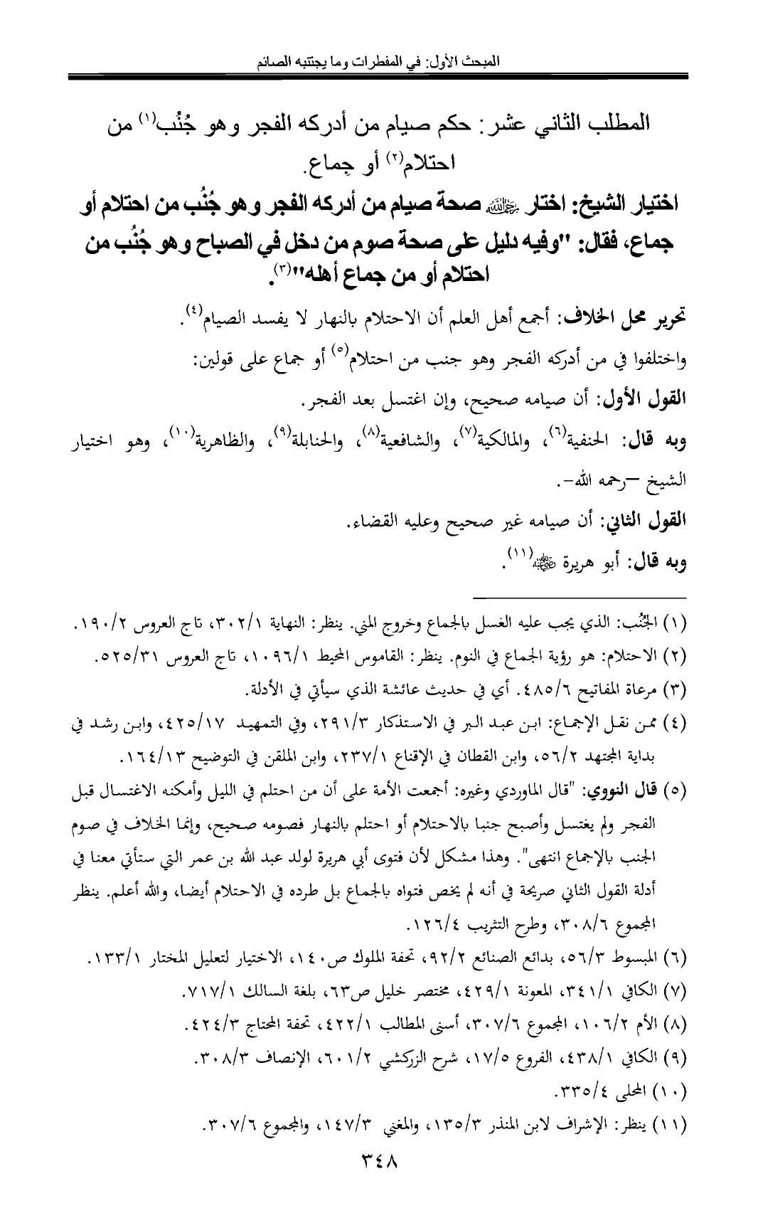 اختيار الشيخ: اختار صحة صيام من أدركه الفجر وهو جُنُب من احتلام أو جماع، فقال: "وفيه دليل على صحة صوم من دخل في الصباح وهو جُنُب من احتلام أو من جماع أهله" (¬3).