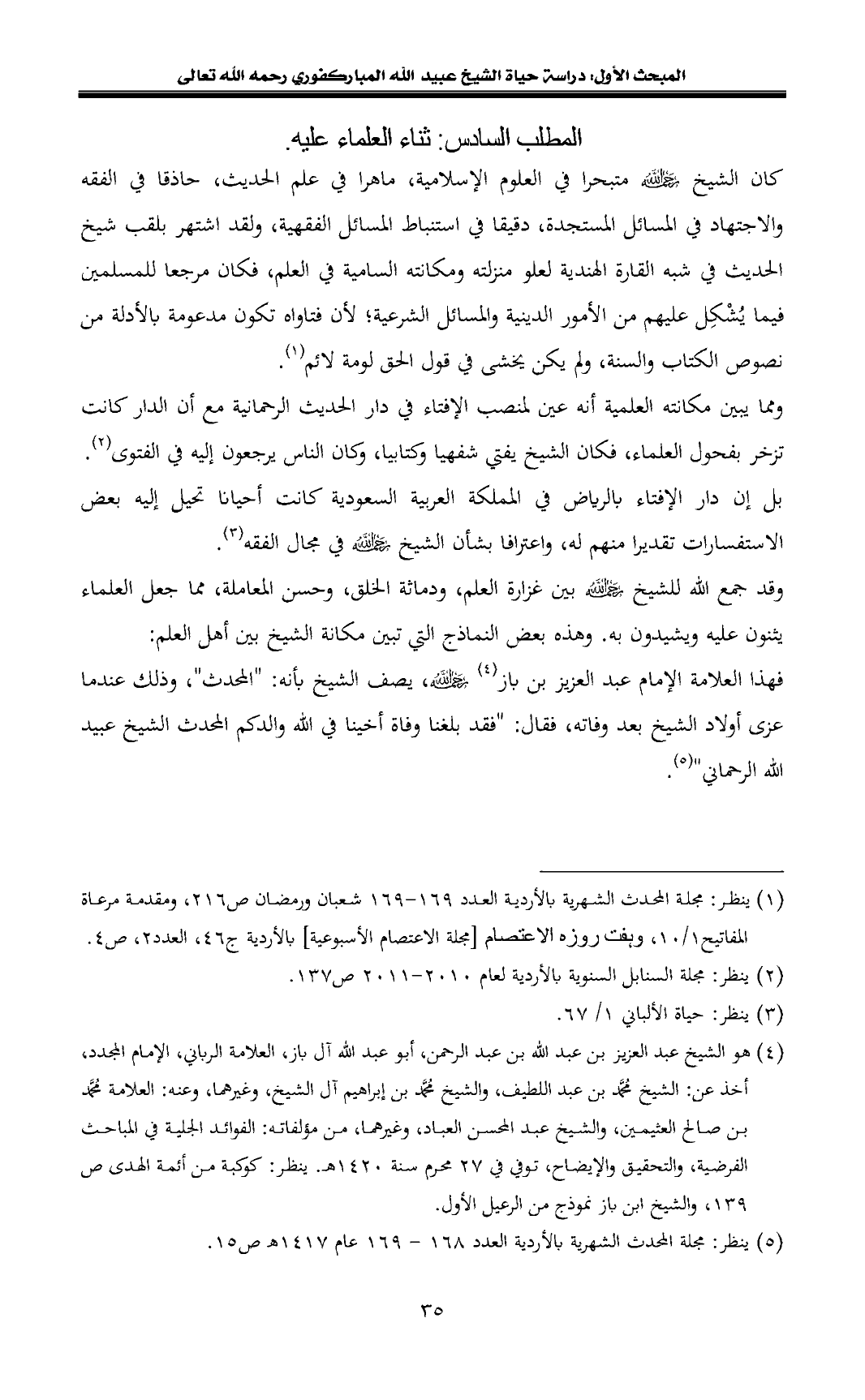 (¬1) ينظر: مجلة المحدث الشهرية بالأردية العدد 169 - 169 شعبان ورمضان ص 216, ومقدمة مرعاة المفاتيح 1/ 10, وہفت روزہ الاعتصام [مجلة الاعتصام الأسبوعية] بالأردية ج 46, العدد 2, ص 4.