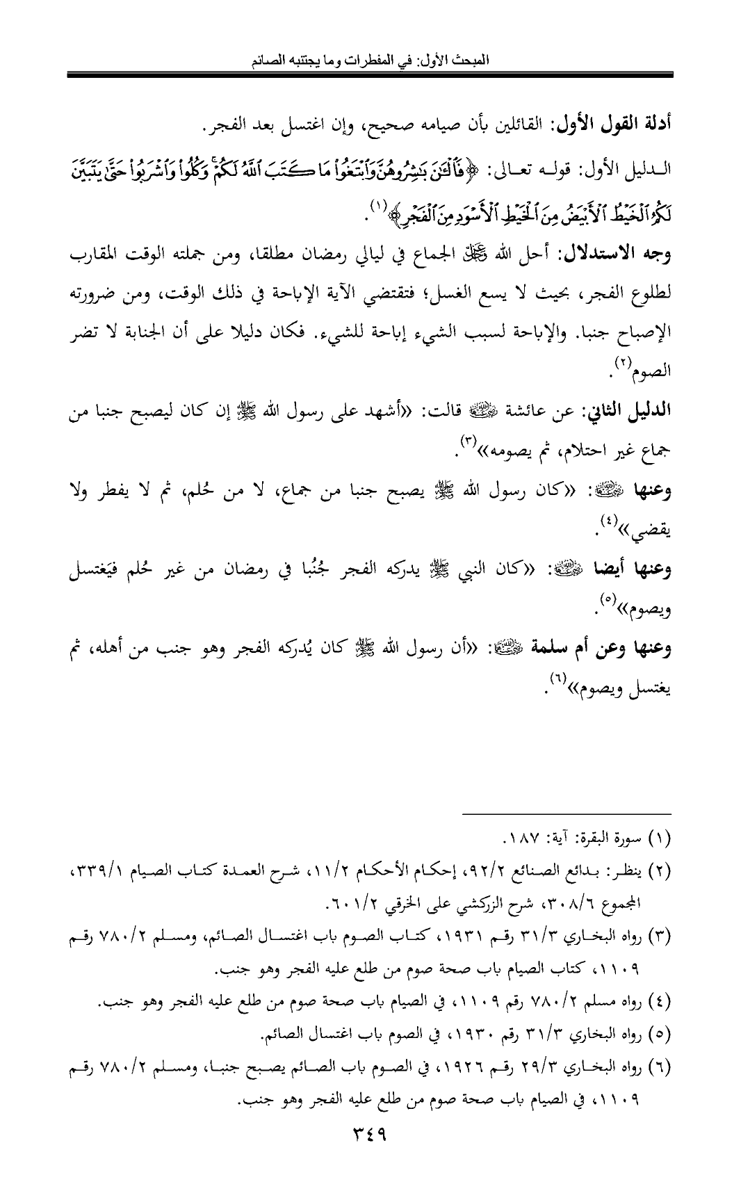 الدليل الأول: قوله تعالى: {فَالْآنَ بَاشِرُوهُنَّ وَابْتَغُوا مَا كَتَبَ اللَّهُ لَكُمْ وَكُلُوا وَاشْرَبُوا حَتَّى يَتَبَيَّنَ لَكُمُ الْخَيْطُ الْأَبْيَضُ مِنَ الْخَيْطِ الْأَسْوَدِ مِنَ الْفَجْرِ} (¬1).